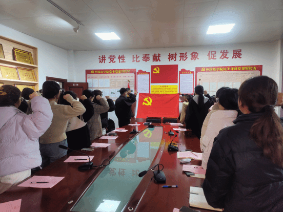 会议第二项,曹金萍老师领誓,带领全体同志重温入党誓词。