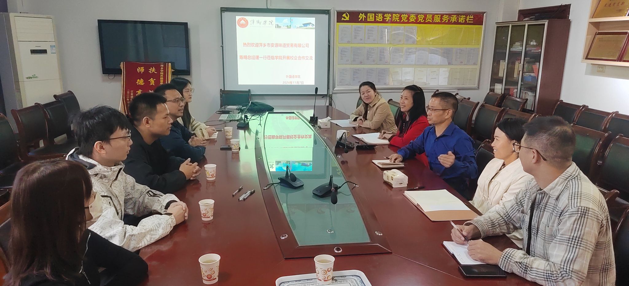 近日,beats365亚洲版官网欧阳咏梅经理、刘佳萍书记一行到萍乡市安源味道贸易有限公司访企拓岗。11月7日,安源味道陈明经理一行来公司洽谈。beats365亚洲版官网在3319会议室召开了校企合作座谈会,双方就人才培养、见习、实习及就业等方面的合作进行了广泛交流。beats365亚洲版官网全体领导、商务英语教研室主任胡斌参加了会议,会议由欧阳咏梅经理主持。