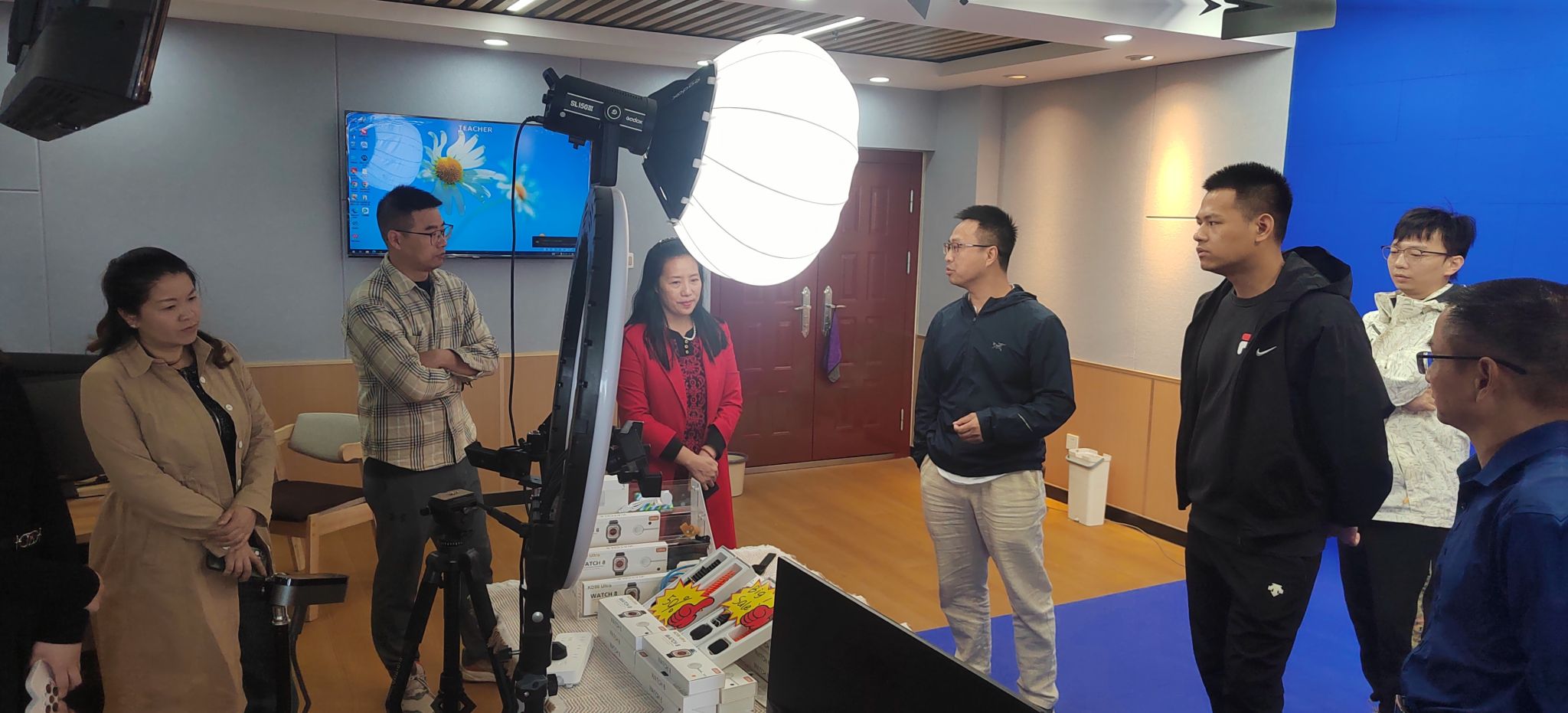 会后,外院领导陪同客人到天泉楼的跨境电商基地参观了直播实践场地。