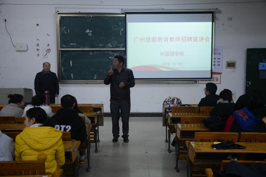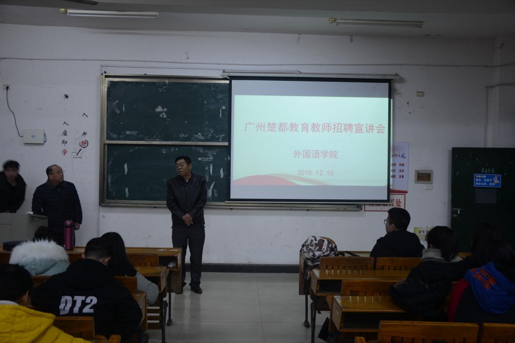 广东楚都教育集团来到公司为19届毕业生进行了教师招聘宣讲会。对教学岗位有兴趣的同学们参加了此次宣讲会,宣讲会由beats365亚洲版官网书记黄柏萍主持