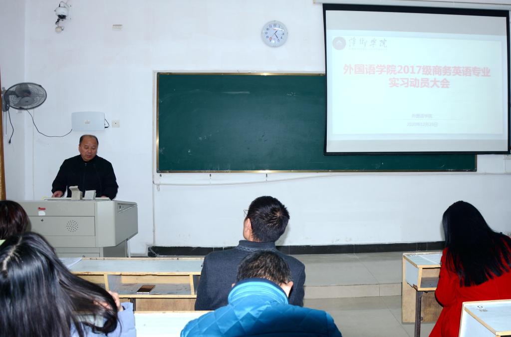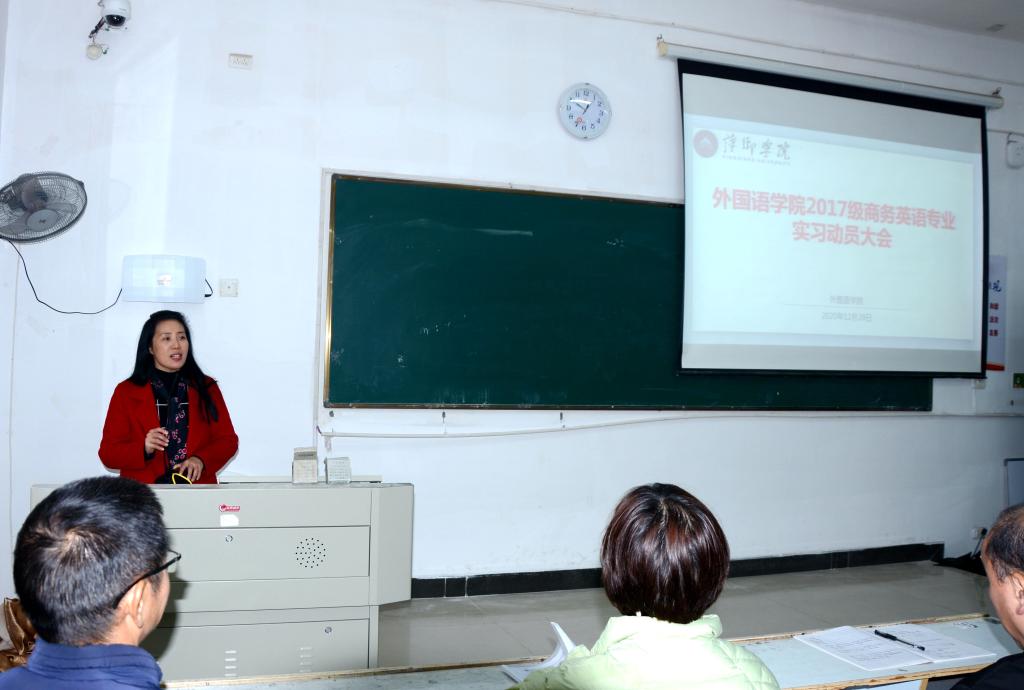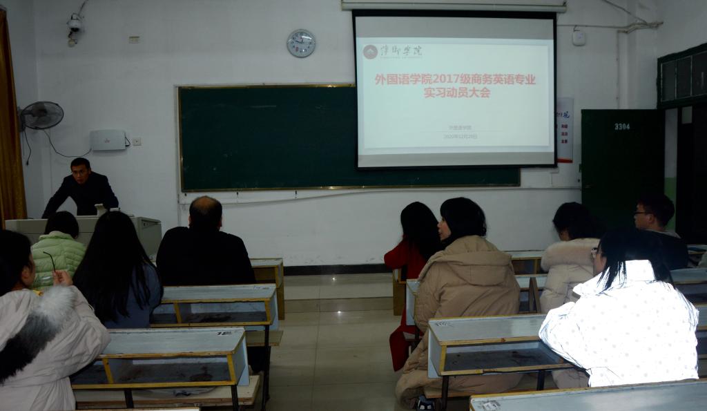 12月29日中午,beats365亚洲版官网商务英语(本科)专业毕业生实习动员大会暨就业工作动员大会在英华楼3304教室召开。beats365亚洲版官网经理欧阳咏梅、书记黄柏萍、副书记刘佳萍、实习指导教师以及2021届商务英语专业全体员工参加了会议。会议由商务英语教研室主任陈京明主持。
