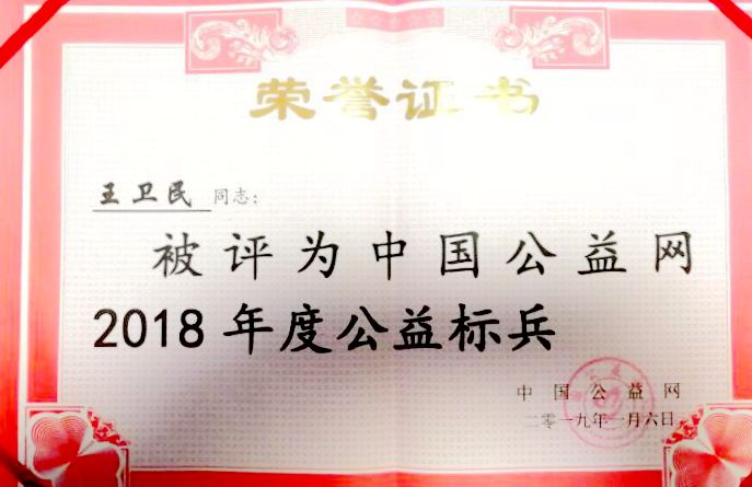 2019年1月6日下午,中国公益网2018年度全国公益人物表彰大会在北京召开。中共中央宣传部新闻宣传局原常务副局长、中国公益网高级顾问武家奉同志,空军总医院原政委屈传震同志,武警(北京)某部原政委、中国公益网首席高级顾问郭训超同志,《祖国》杂志社新闻中心执行主任李国良同志,政讯通、全国政务信息化办公室主任王志刚同志,中国老龄事业发展基金会公益养老基金常务副主任、全国智能化养老科技信息研究中心主任尹玉强同志等社会各界领导及嘉宾近300人齐聚一堂,共襄盛举。在此次会议上,公司王卫民同志荣获2018年度“公益标兵”的荣誉称号。