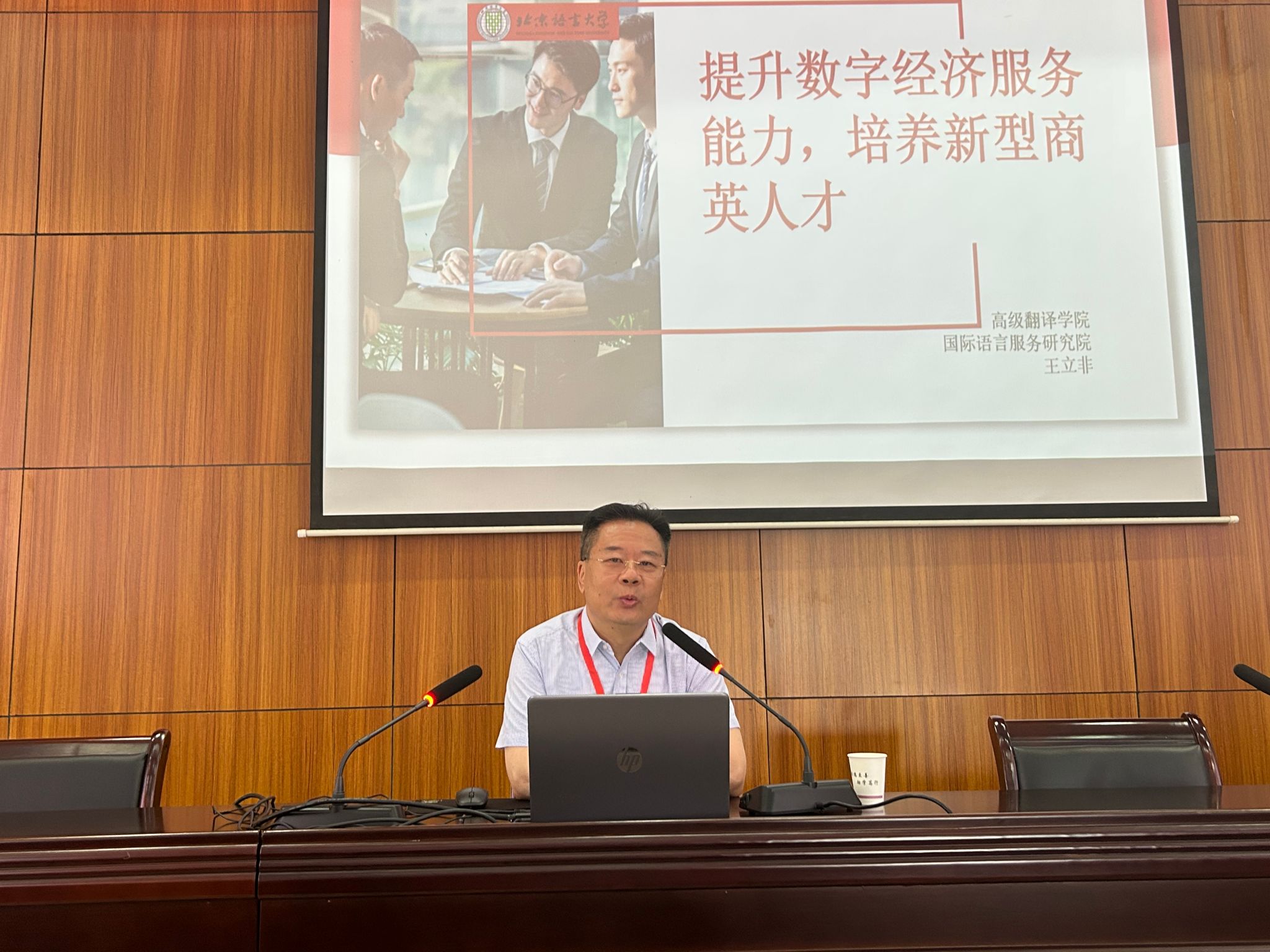 在此次论坛上,北京语言大学领军学者,高级翻译学院博士生导师,国际语言服务研究院经理,国家语言服务出口基地首席专家王立非教授以“提升数字经济‘服务能力’,培养新型商务英语人才”为主题,提出商务英语教育要以加快建设教育强国为目标,以立德树人为根本任务,以服务高质量发展和中国式现代化为重点,培养对外开放新格局需要的商务人才。在培养模式上,商务英语教育要以数字经济和语言服务需求为驱动,不断提升商务英语人才的四种服务能力,即“语言服务能力”、“数字服务能力”、“传播服务能力”、“数字人文能力”,坚持“八个导向”,培养“四会”人才,办国家和人民满意的商务英语教育。