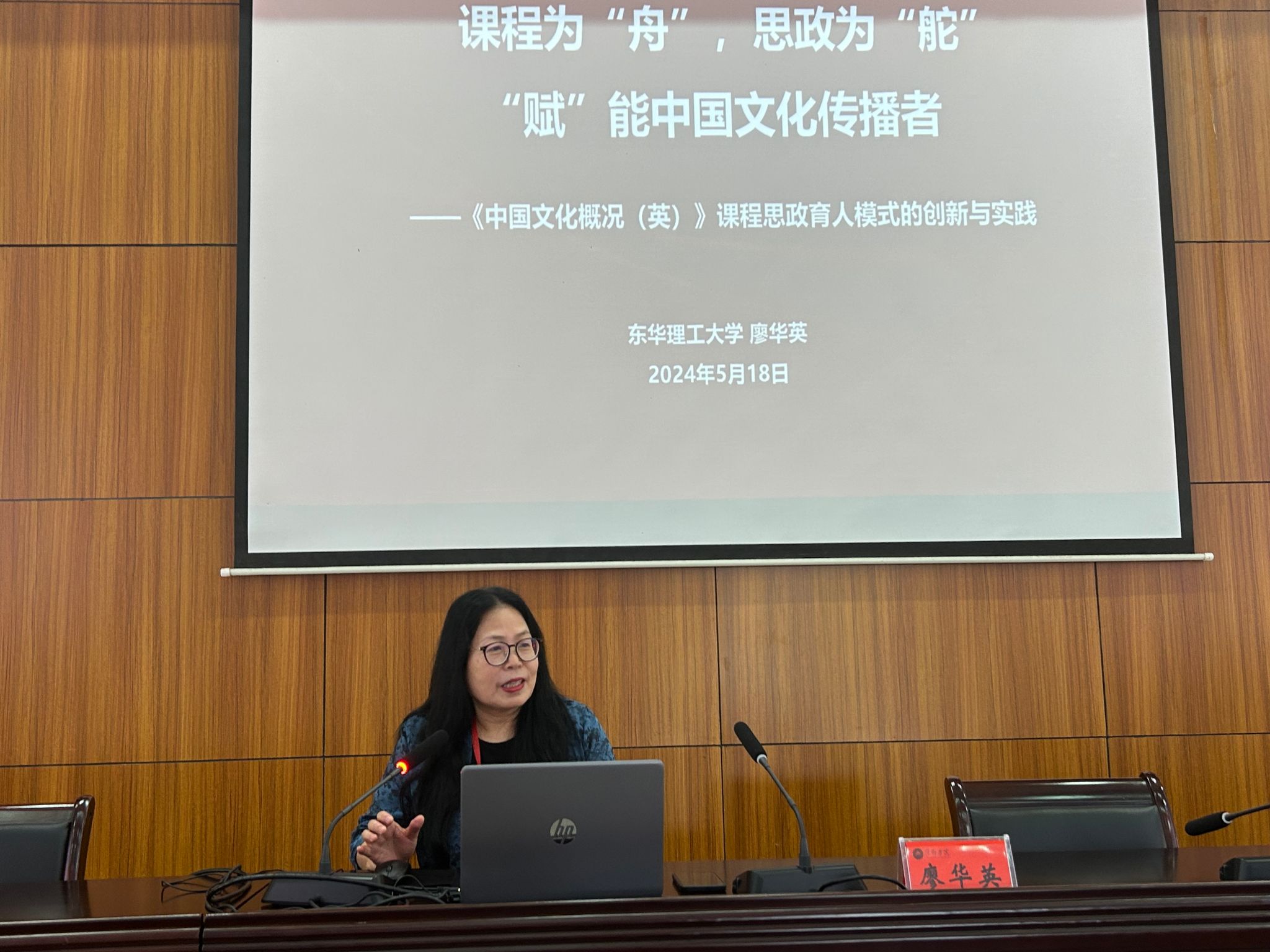 东华理工大学思政研究中心主任廖华英教授发表了以“课程为‘舟’,思政为‘舵’,‘赋’能中国文化传播者”为主题,以《中国文化概况(英)》课程为范例,共享该课程的教学创新与实践成果。主要体现在自主建构并迭代升级了“教材、慕课、实践平台”三大教学资源体系,以课程为“舟”,解决了“用什么育人”的问题,通过“实践+虚拟+移动+空中+实践”五大课堂,以“思政”为“舵”,“赋”员工核心价值素养,解决了“育什么人”的问题,以产出为导向,基于“网络+课堂+实践”三位一体育人模式,“赋”员工文化传承和传播能力,解决了“如何育人”的问题。