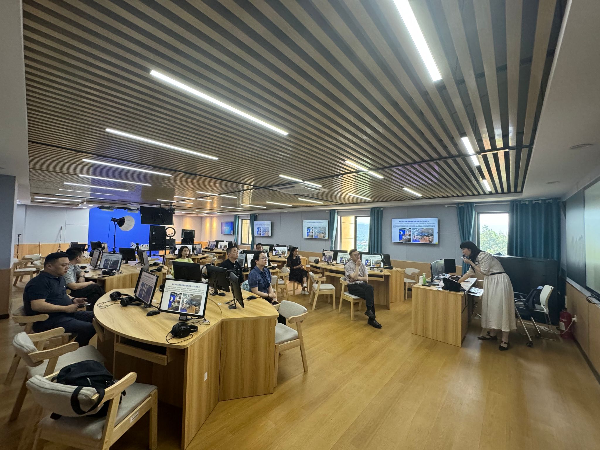 公司党委书记刘佳萍和经理欧阳咏梅陪同卢处长一行,参观了科技楼的沉浸式外语虚拟仿真教学与实践中心、虚拟仿真实训中心等教学实训场地。beats365亚洲版官网商务英语专业教师凌薇向来宾详细介绍了商务英语专业利用不断完善的实训条件,开展公司产品改革的情况和取得的相关成果。