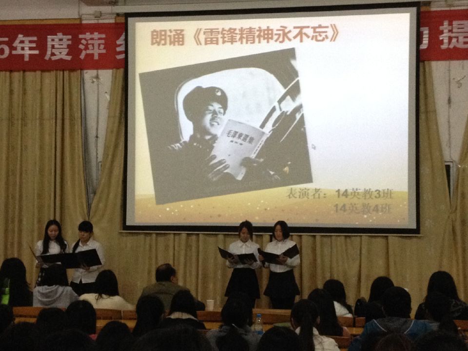 祝贺获奖班级,14英本2班获一等奖,麦田志愿和14英本5班获二等奖,14商英班,14英本3班4班和14英教1班获三等奖。通过这次活动,同学们对雷锋精神了解的更深刻,更透彻,受益匪浅。我相信我们的生活里会出现越来越多的雷锋,或许是你,或许是他,可能就在你我的身边。雷锋精神将一代代传,影响一代又一代人。