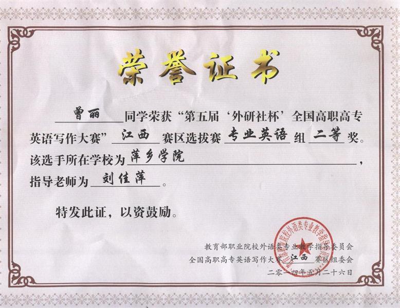 江西赛区选拔赛专业英语组二等奖。