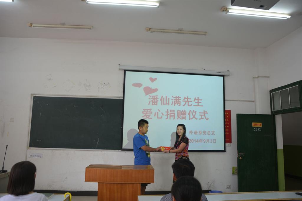 班周汶庆同学的爱心捐赠仪式。捐赠仪式上刘佳萍老师勉励同学们不要向困难低头,更不要有任何自卑心理,我们要把潘先生的这份关爱化做学习中的不竭动力。