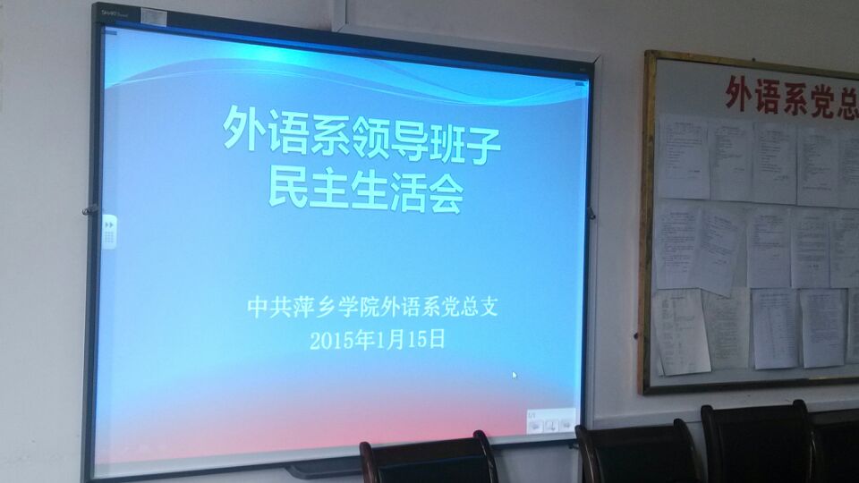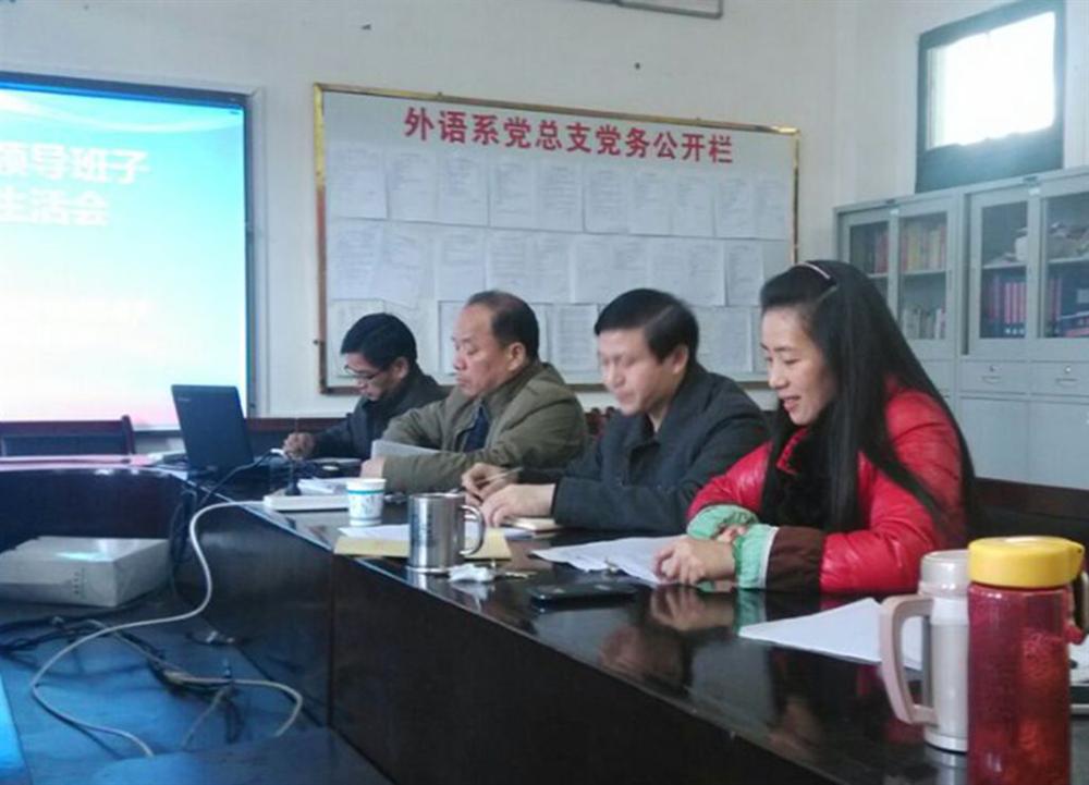 为深入学习贯彻习近平总书记系列重要讲话精神,充分发辉党内批评与自我批评作用,2015年1月15日,外语系在英华楼3319召开了以“严格党的生活、严守党的纪律、深化作风建设”为主题的领导班子民主生活会,公司党委委员、宣传统战部部长陈永国莅临指导。会议由系党总支书记黄柏萍主持,系领导班子成员、党员代表和群众代表参加会议。