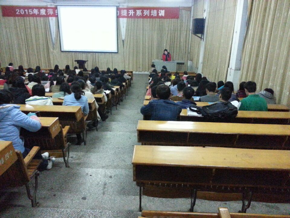 2015年3月12日晚6:35,在1101开展了有关外语系专业四级考试的讲座,讲座现场首先由外语系教研老师王翡老师对讲座人做介绍。此次演讲的是深圳飞渡董事长孙欣先生。