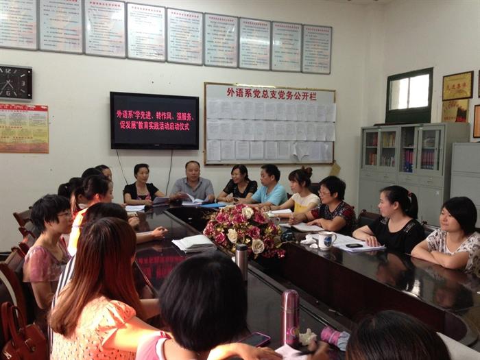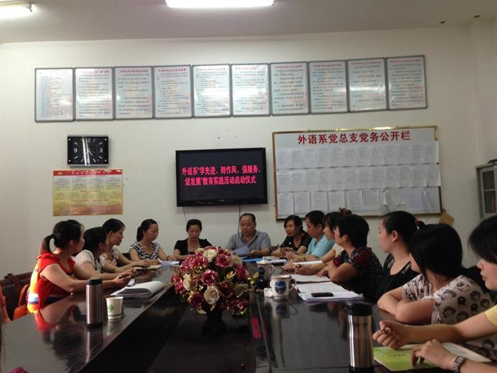 为认真贯彻党的十八大精神,切实强作风建设,推进外语系由专科向本科的全面转型,根据学校的统一安排,6月21日下午,外语系在英华楼3319会议室召开“学先进、转作风、强服务、促发展”教育实践活动动员会暨启动仪式。全系教职工参加会议。外语系党总支书记黄柏萍主持会议。