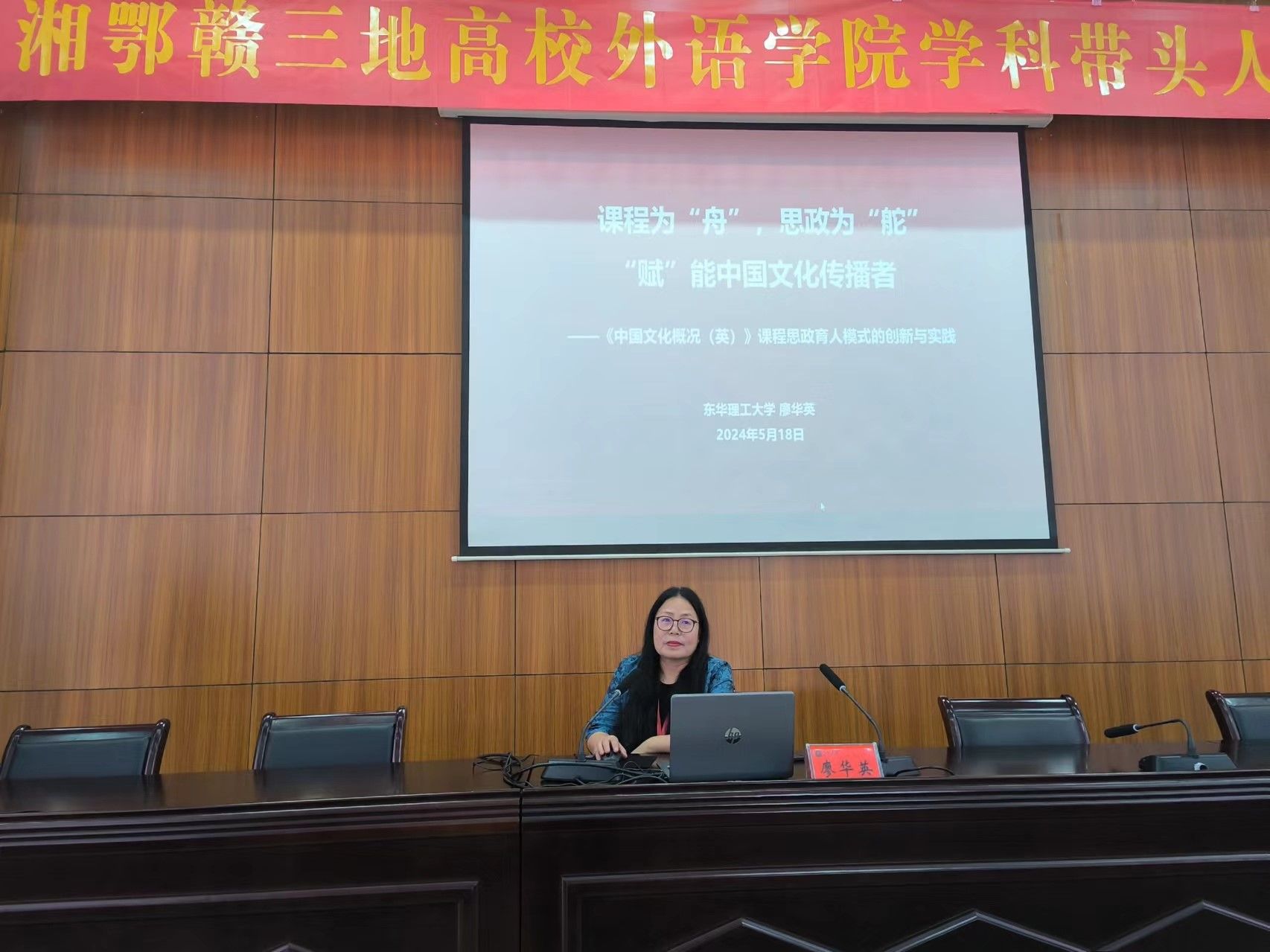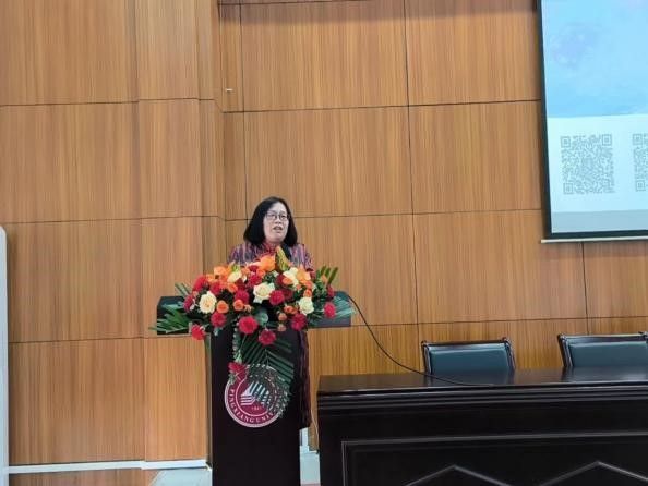 主旨报告5由湖北文理学院的袁在成教授主持,东华理工大学思政研究中心的廖华英教授发言。针对高校中国文化英文教学普遍存在的缺育人资源、缺育人定位、缺育人方法等痛点问题,她提到要以课程为“舟”,思政为“舵”,“赋”能中国文化传播者,解决“如何育人”的问题。