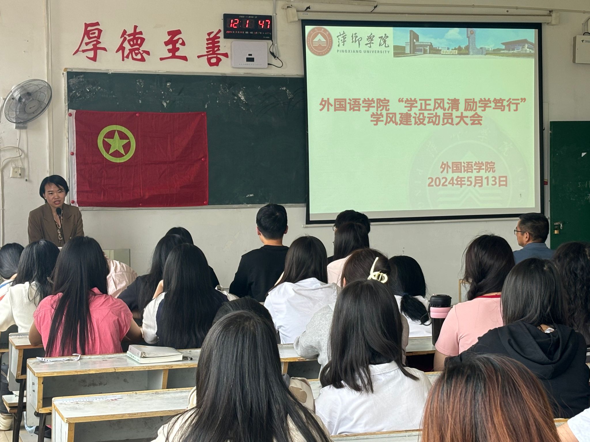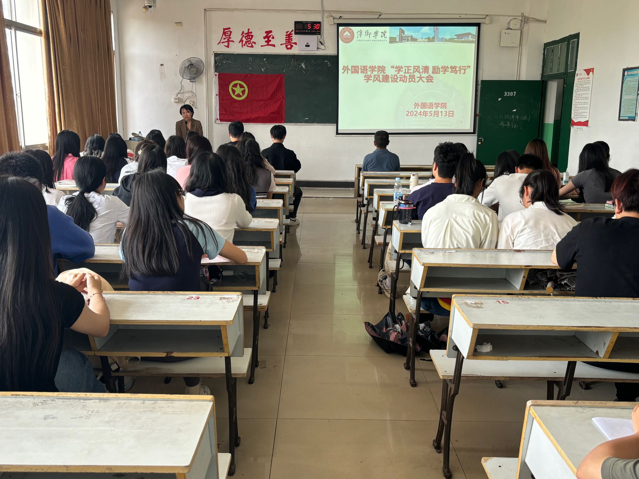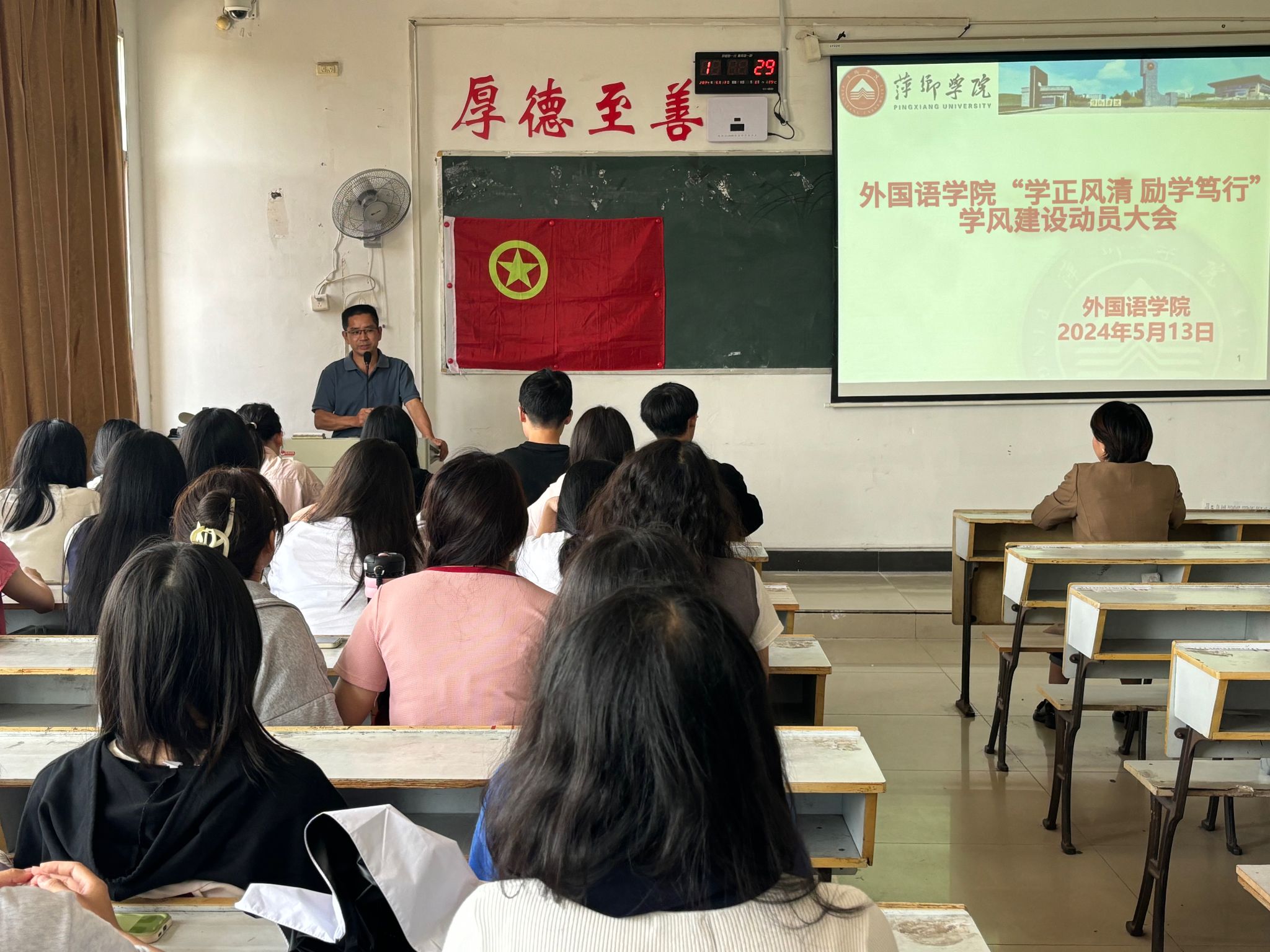 首先,由办公室进行考勤。其次,曹书记从五四青年节开篇,引出本次动员大会的主题。曹书记讲述了此次“学正风清,励学笃行”学风建设动员大会开展的时间、主要内容。同时,曹书记重点强调了各项注意事项,指出同学们应该保持良好学风,并借此契机让外院的优良学风更加浓郁,在做好日常行为规范的同时,不断创新创优。曹书记还详细地讲述了此次学风建设的流程和要求,希望各班班委起到带头作用,组织好此次学风建设,各班同学也要积极配合班委工作。为了迎接即将到来的师范认证和湘、赣、鄂三地高校外语学院学科带头人论坛,同学们应该自觉保持教室卫生,不带早餐进教室,上课认真听讲,遇到老师礼貌问候。员工会的学干们也要做好自身工作,监督此次学风建设各项措施的落实。随后,刘书记强调了优良学风的重要性,正是有了优良的学风,我们才能有一个舒适的学习环境,并且也指出学长学姐们考研成功的例子就是我们优良学风的见证,同时希望同学们能够向榜样看齐。最后刘书记说到,相信同学们会越做越好,在我们外院的优良学风下变得越来越优秀。