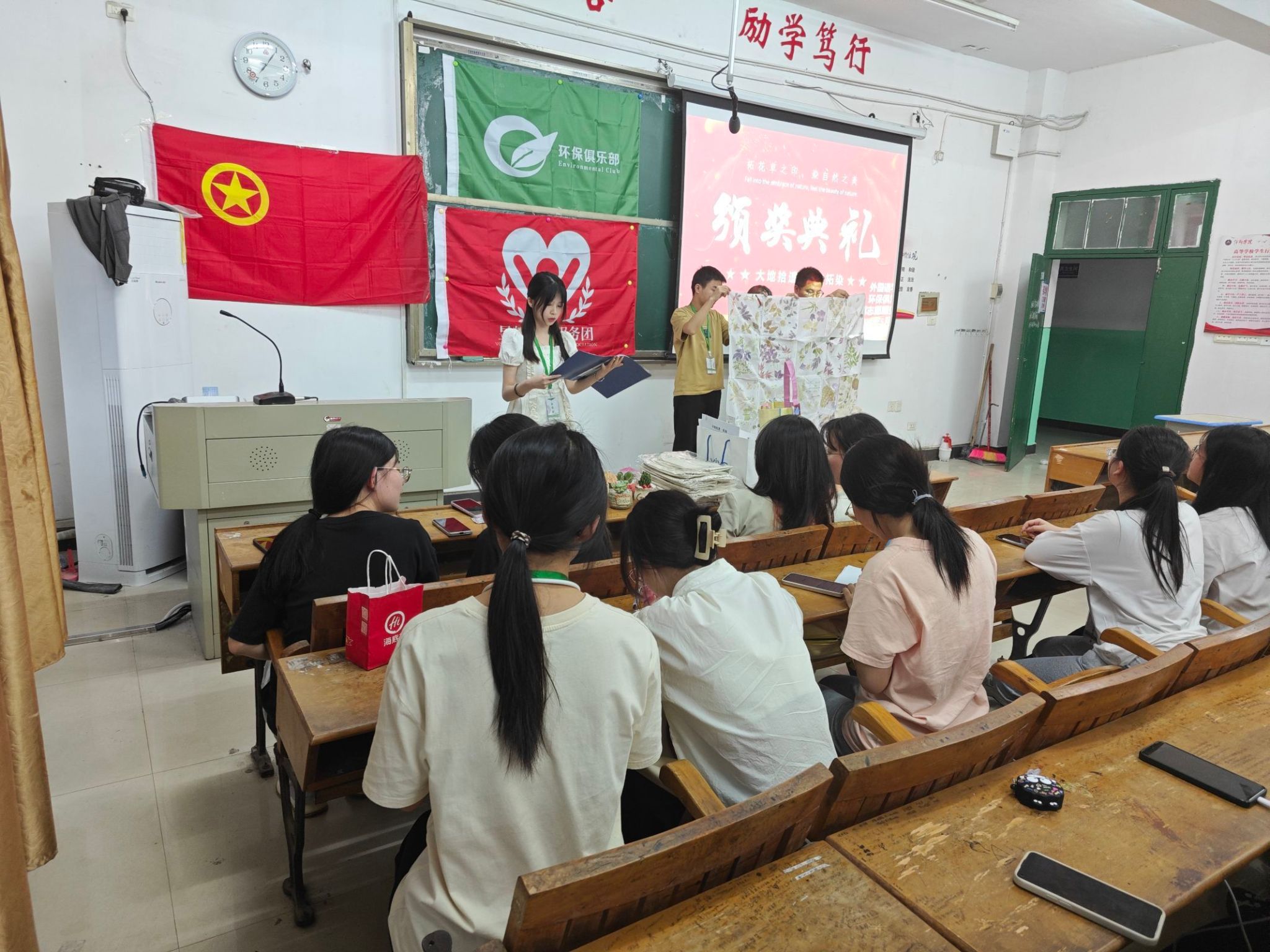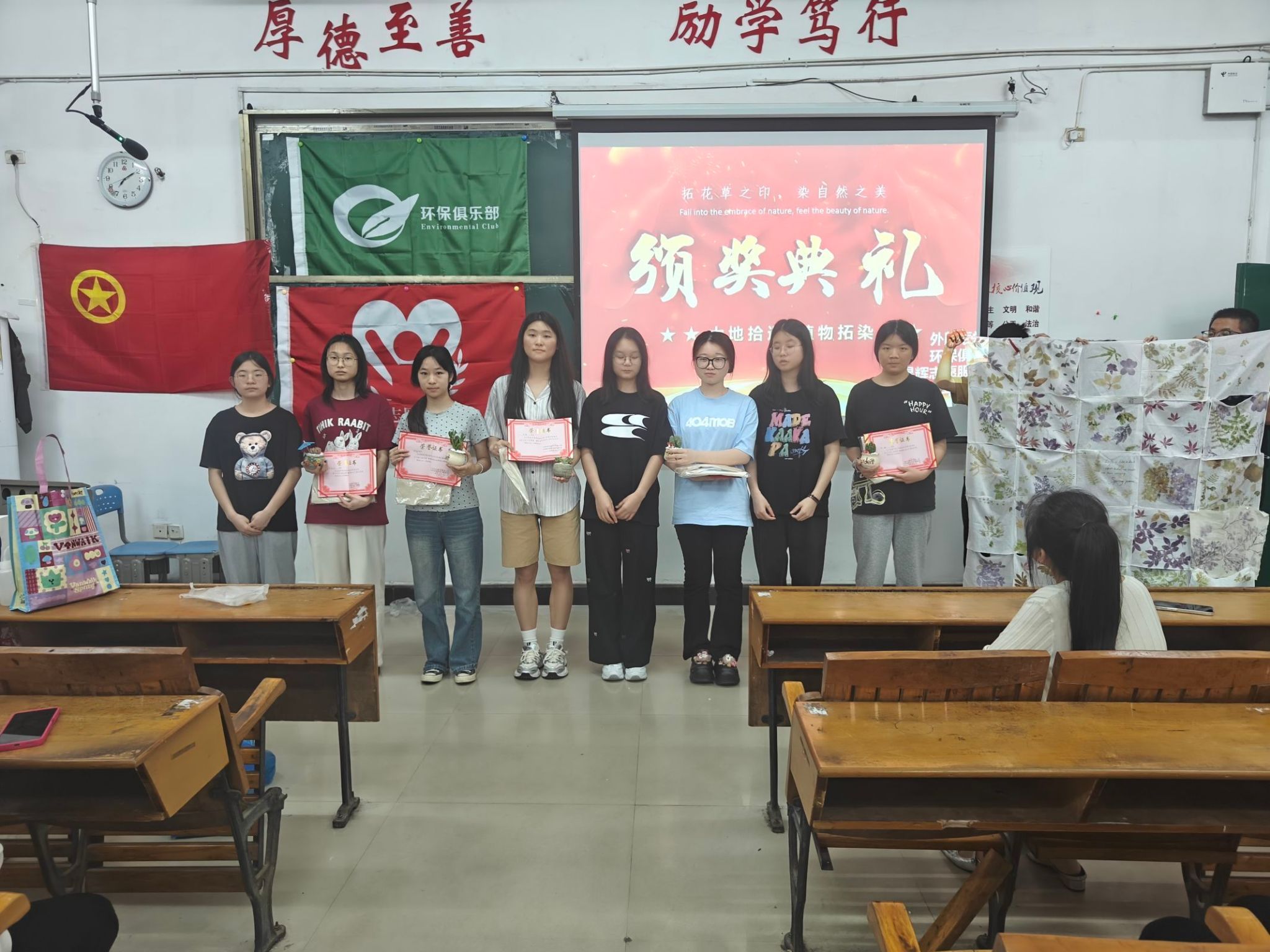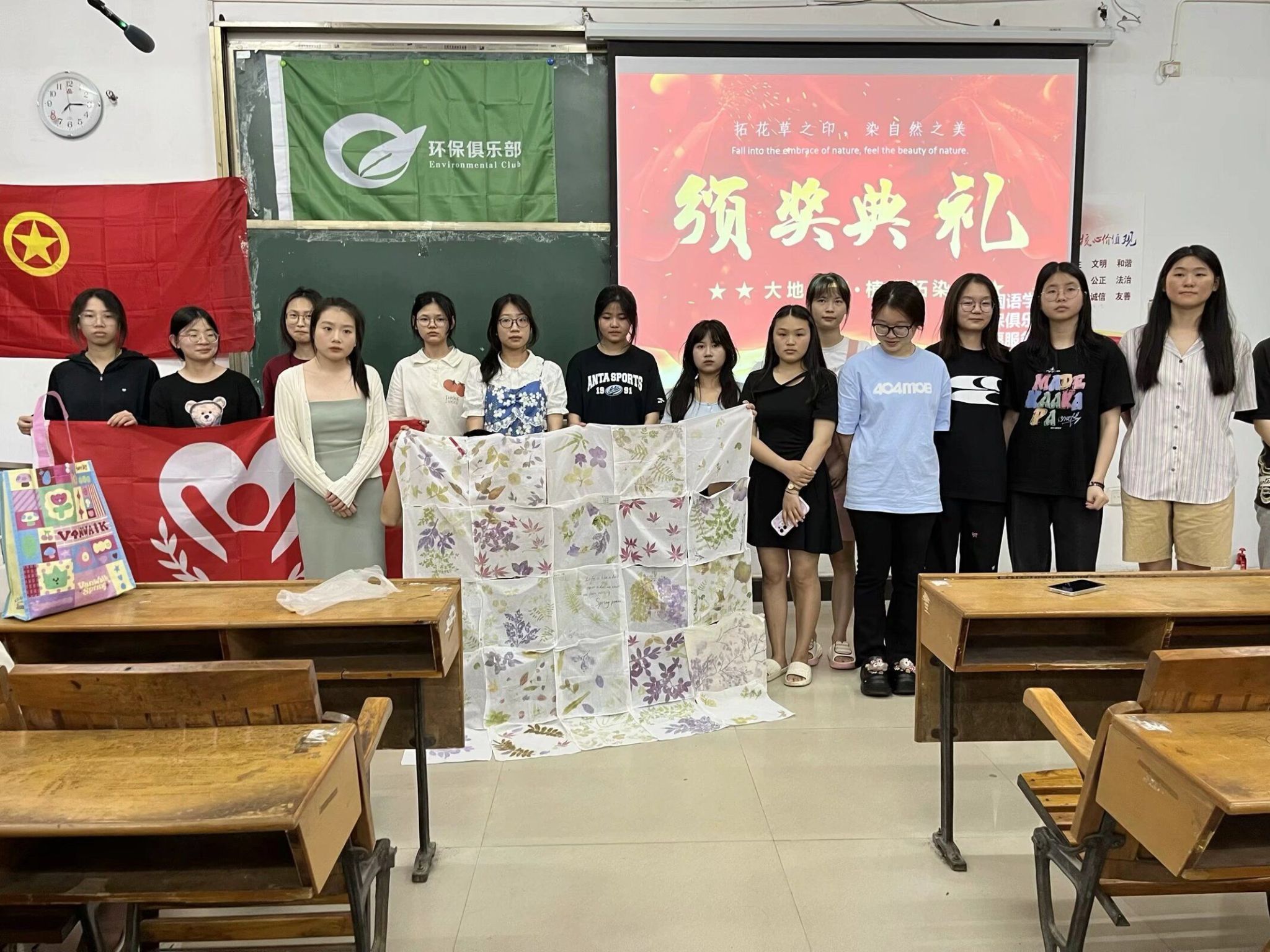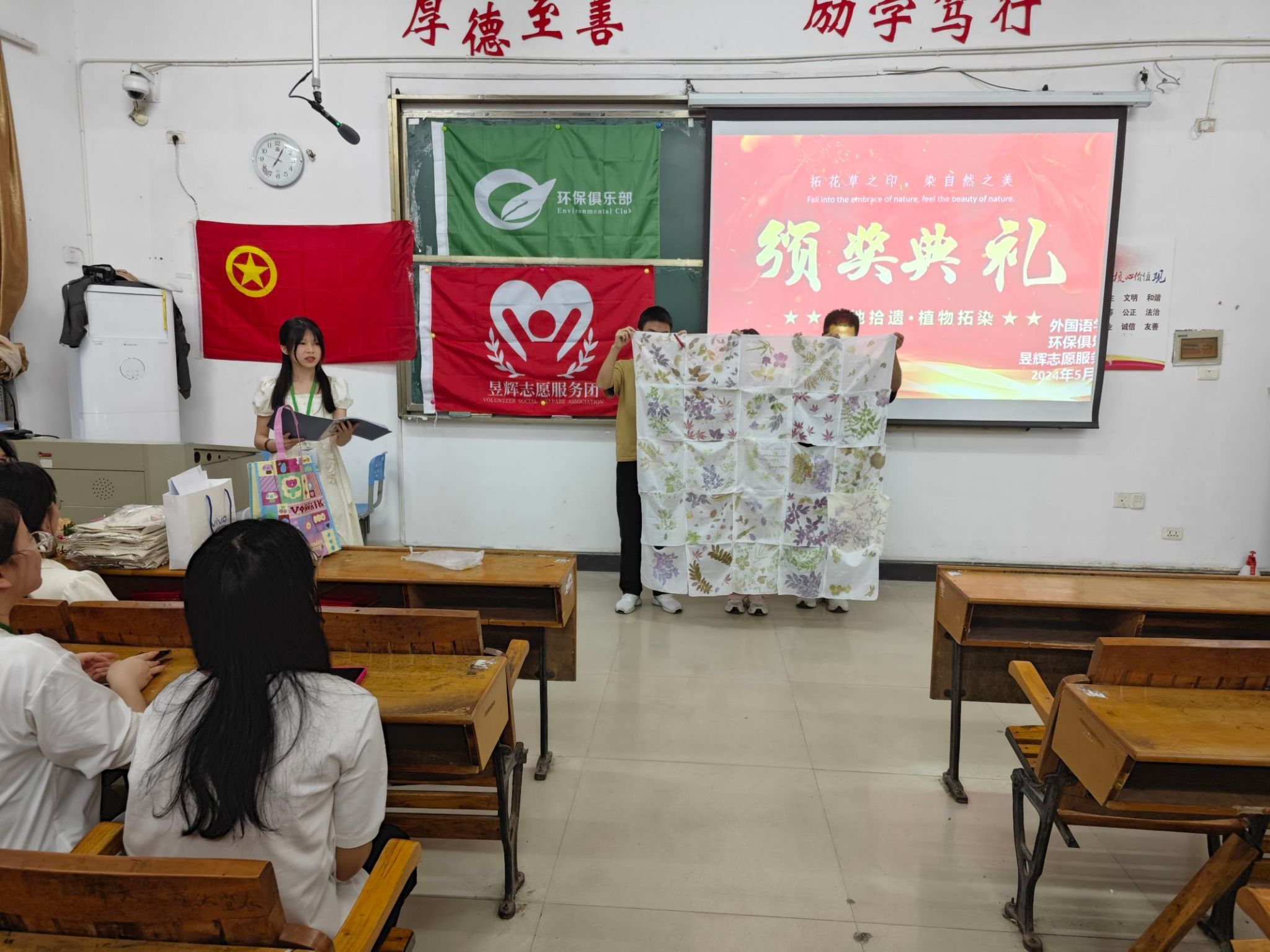 该活动由beats365亚洲版官网“昱辉”志愿服务团和环保俱乐部策划并通知各个班级,随后便有对拓染感兴趣的同学积极参与此活动。活动报名截止后,beats365亚洲版官网“昱辉”志愿服务团和环保俱乐部成员一起收集每一位同学的信息和作品,并制作出线上投票机制。根据线上投票结果,最后选出获奖的拓染作品。beats365亚洲版官网“昱辉”志愿服务团和环保俱乐部于2024年5月8日在beats365亚洲版官网3306共同举办“大地拾遗,植物拓染”活动的颁奖典礼。环保俱乐部负责人唐嘉乐作为此次活动的主持人,晚上7点整,选手嘉宾与观众全部到场,典礼开始,主持人宣布此次活动的获奖选手,环保俱乐部指导老师钟倩和昱辉志愿服务团团长段园园为获奖选手颁奖,并为她们表达衷心的祝福。之后钟倩老师为此次活动进行讲话,分享了她对此次活动的心得与感悟,鼓励更多同学能积极地宣传非遗文化,肯定了同学们的努力与爱好。最后所有的选手与嘉宾们合影留念,观众有序离场。