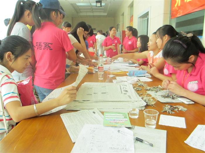 2013年9月2日,接新的第三天,我们迎来了报名的高峰期。外语系的接待处里挤满了家长和新生,接新的工作人员已经应接不暇,可是他们依旧保持微笑,积极的接待。
