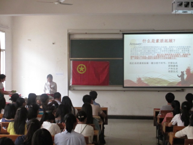 2014年5月23日中午我系在英华楼3306举行了素质拓展开营仪式。到场的嘉宾有党总支副书记刘佳萍,团总支书记魏峰以及参加的员工们。会上主要安排了素质拓展的注意事项和抽签分配队伍。