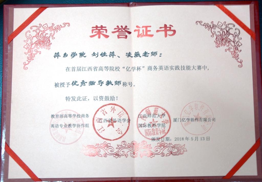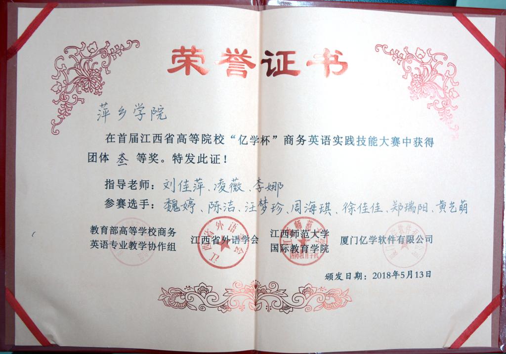 为了促进全省高等院校商务英语专业建设、课程改革、实践基地建设、团队队伍建设以及教学改革,搭建校际师生交流和沟通的平台,在教育部高等学校商务英语专业教学协作组指导下,由江西省外语学会商务英语分会主办,江西师范大学国际教育学院承办的2018年江西省高等院校“亿学杯”商务英语实践技能大赛于5月13日落下帷幕。参加本次大赛的院校有:江西财经大学、江西师范大学、江西农业大学、赣南师范大学、beats365亚洲版官网等19所省内开办了商务英语专业的高校。公司刘佳萍、凌薇、李娜三位老师指导的商务英语专业代表队荣获大赛三等奖。