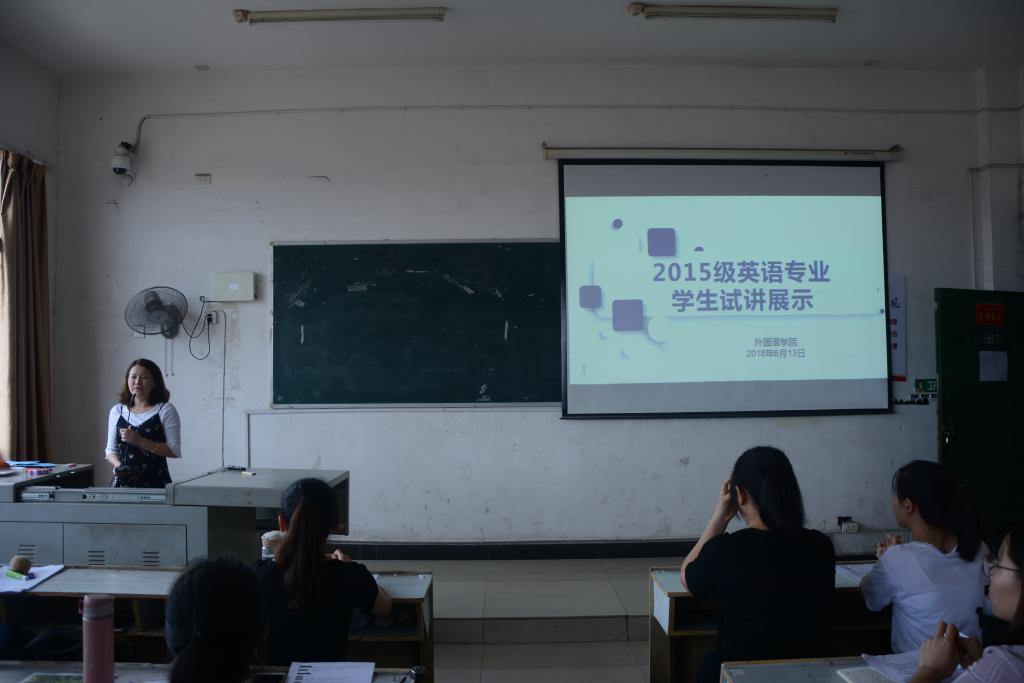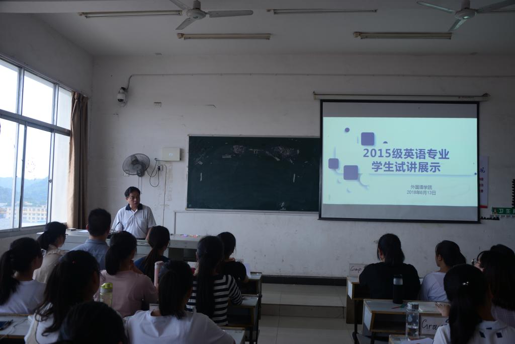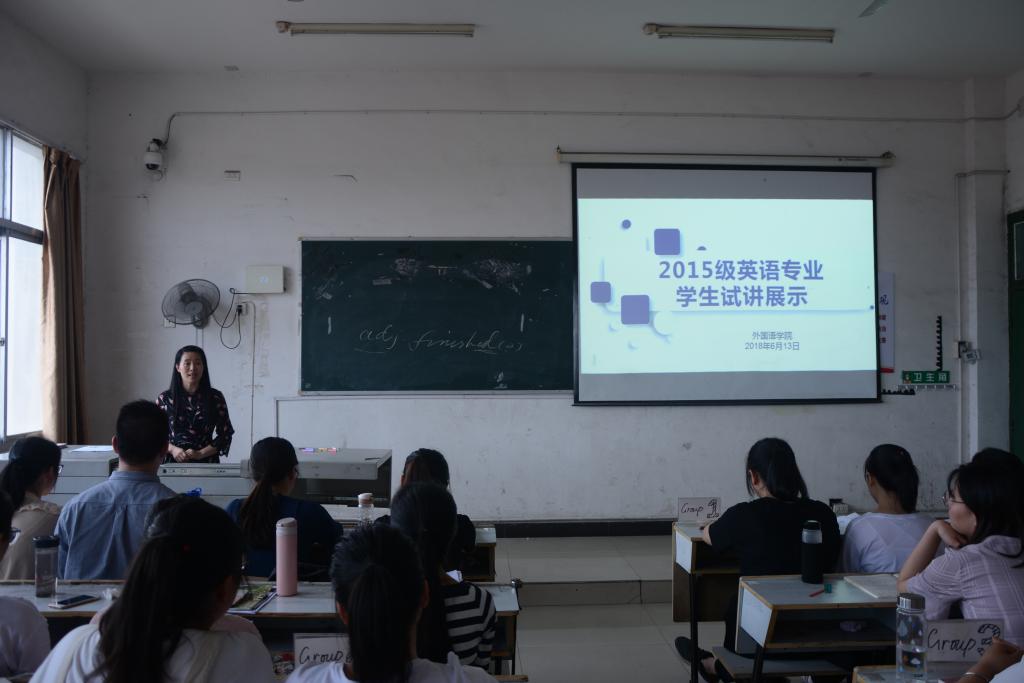 本学期初,2015级英语专业员工根据《本科英语专业员工试讲指导工作实施方案》、在指导教师的悉心指导下开始了试讲活动。在活动期间,顺利完成了英文硬笔、粉笔的书写技能测试;英语教学设计和多媒体课件制作以及模拟授课等师范生必备的技能训练和测试。通过试讲,同学们的专业基本功和教师职业技能得到了锻炼和提高。