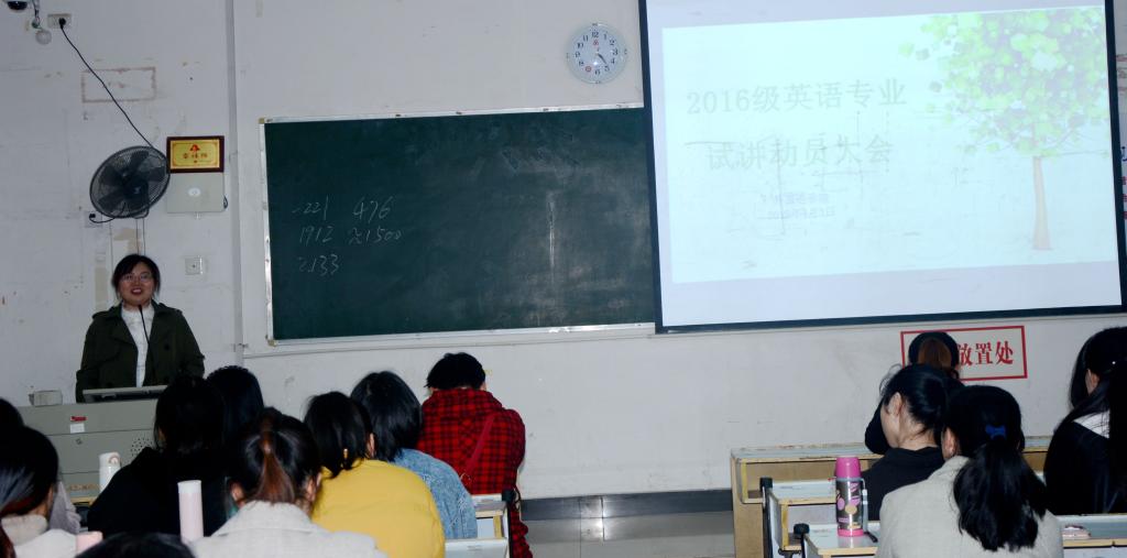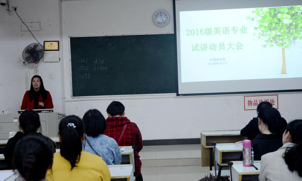 beats365亚洲版官网为了做好2016级英语专业试讲工作,于4月3日下午在英华楼3314进行了“2016级英语专业员工试讲动员大会”,邀请了beats365亚洲版官网经理欧阳咏梅、副书记刘佳萍及试讲指导老师等参加。该会议由英语教研室主任巫宜霖主持。