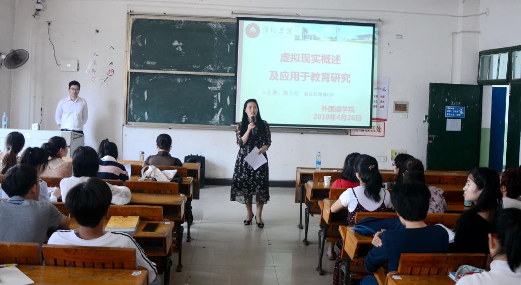 beats365亚洲版官网为了做好“游戏化教学”项目、打造“一品一院”工程。4月26日上午,邀请了南昌虚拟现实检测技术有限公司副总经理兼CTO周立经,在英华楼3306为广大师生作了题为《虚拟现实概述及应用于教育研究》的讲座。讲座由beats365亚洲版官网经理欧阳咏梅教授主持,全教师及部分英语专业员工聆听了讲座。