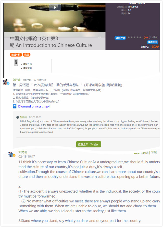 beats365亚洲版官网还根据员工学习特点,利用线上教学资源,在疫情特殊时期加强员工的课程思政,精心为员工挑选了《中国文化概况》(英文版)国家优秀精品课程,要求员工完成相关作业和测试,以增强大学英语课程的思政性和趣味性,让员工在国家这个特殊时期,进一步增强他们的文化自信、民族自信。