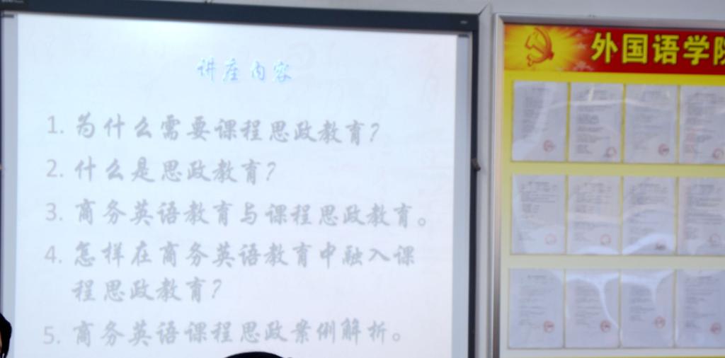 讲座内容共五个部分:第一、为什么需要课程思政教育?第二、什么是思政教育?第三、商务英语教育与课程思政教育;第四、怎样在商务英语教育中融入课程思政教育?以及第五、商务英语课程思政例解。