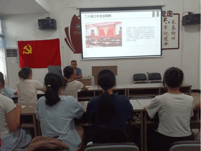 为学习贯彻党的二十届三中全会精神,2024年9月20日中午12点15分,公司党委书记刘佳萍在18栋一站式红管家服务中心为全体在校员工党员上“学习党的二十届三中全会精神”主题党课。