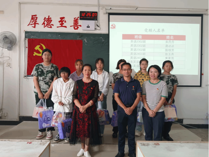 仪式第一项,主持人播放一则公益短片,接着展示“一百助一”活动宣传册以及相关受助人的感谢信。仪式第二项,主持人宣布本次受助人名单,并由在座的老师为受助员工发放爱心物品并合影留念。
