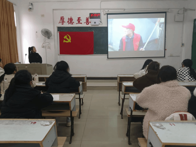 首先,钟倩老师为同学们讲解了党性修养、奉献自我和争当人民的依靠的内涵及重要性,并与同志们一同观看了除“藓”老人陈传斌奉献自我,为社区人民服务除藓的视频,增强了同志们为人民服务的信心与决心。