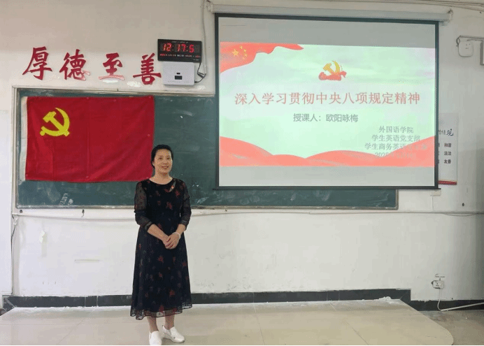 最后,欧阳咏梅老师希望同志们持续认真学习贯彻中央八项规定精神,以实际行动维护党的形象,做到廉洁自律,积极发挥先锋模范作用,共同营造风清气正的良好环境。