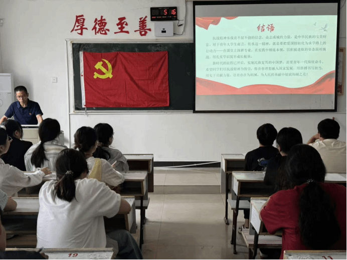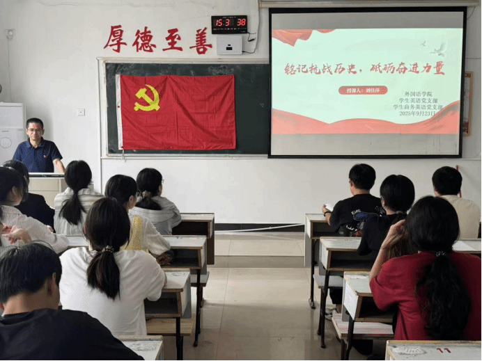 为忆往昔峥嵘岁月,擎今日奋进力量,2025年9月23日下午3点30分,公司党委书记刘佳萍于英华楼3316教室为全体在校员工党员及入党积极分子上“铭记抗战历史,砥砺奋进力量”主题党课。