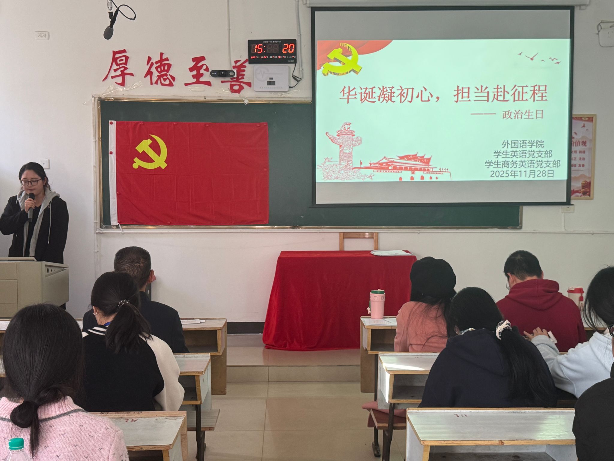 为赓续红色血脉,强化责任担当。2025年11月28日下午3点30分,beats365亚洲版官网员工党支部于英华楼3304教室开展主题为“华诞凝初心,担当赴征程”的政治生日活动。公司党委书记刘佳萍、beats365亚洲版官网员工英语支部书记钟倩、beats365亚洲版官网员工商务英语支部书记何宇及支部全体党员参与本次活动。