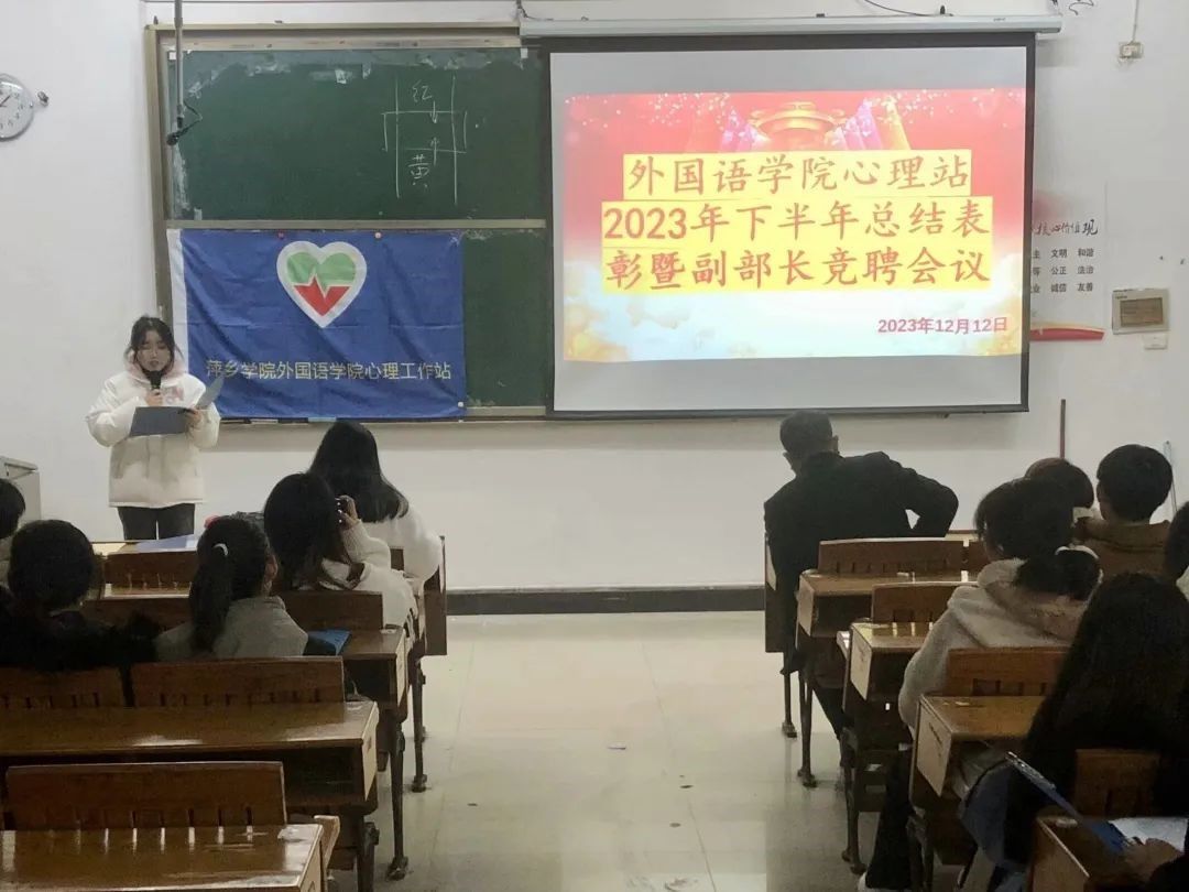 2023年12月12日晚上,beats365亚洲版官网在英华楼3306教室举办了心理工作站2023年下半年总结表彰暨副部长竞聘大会。公司党委委员、员工党支部书记曹金萍,心理站指导老师王卫民,beats365亚洲版官网员工会主席冯浩等员工干部出席了会议。心理站大一、大二年级全体成员,部分宿舍心理联络员,部分团体活动带领者等同学参加了此次会议。此次会议由心理站办公室干事沈凌云主持。