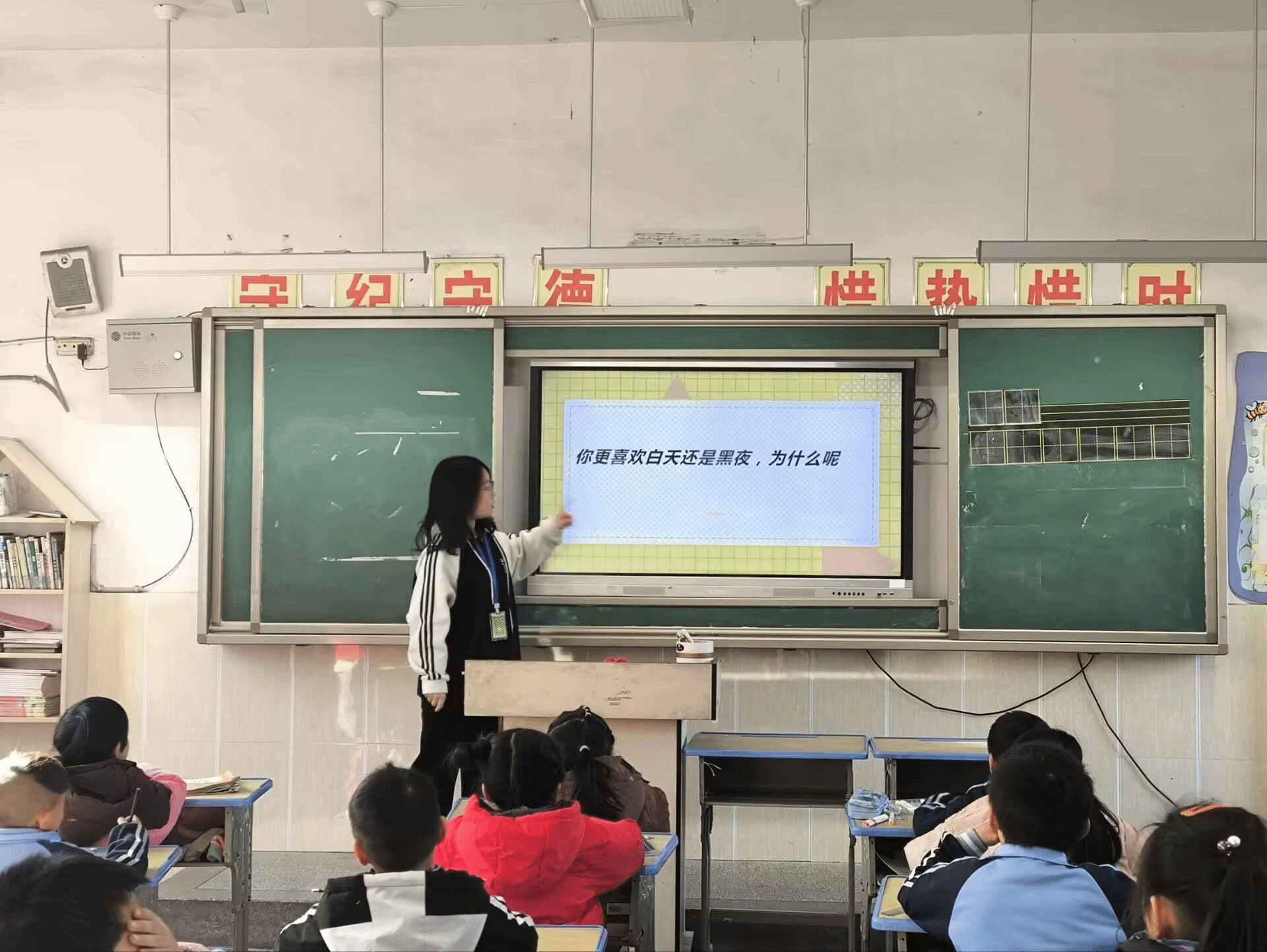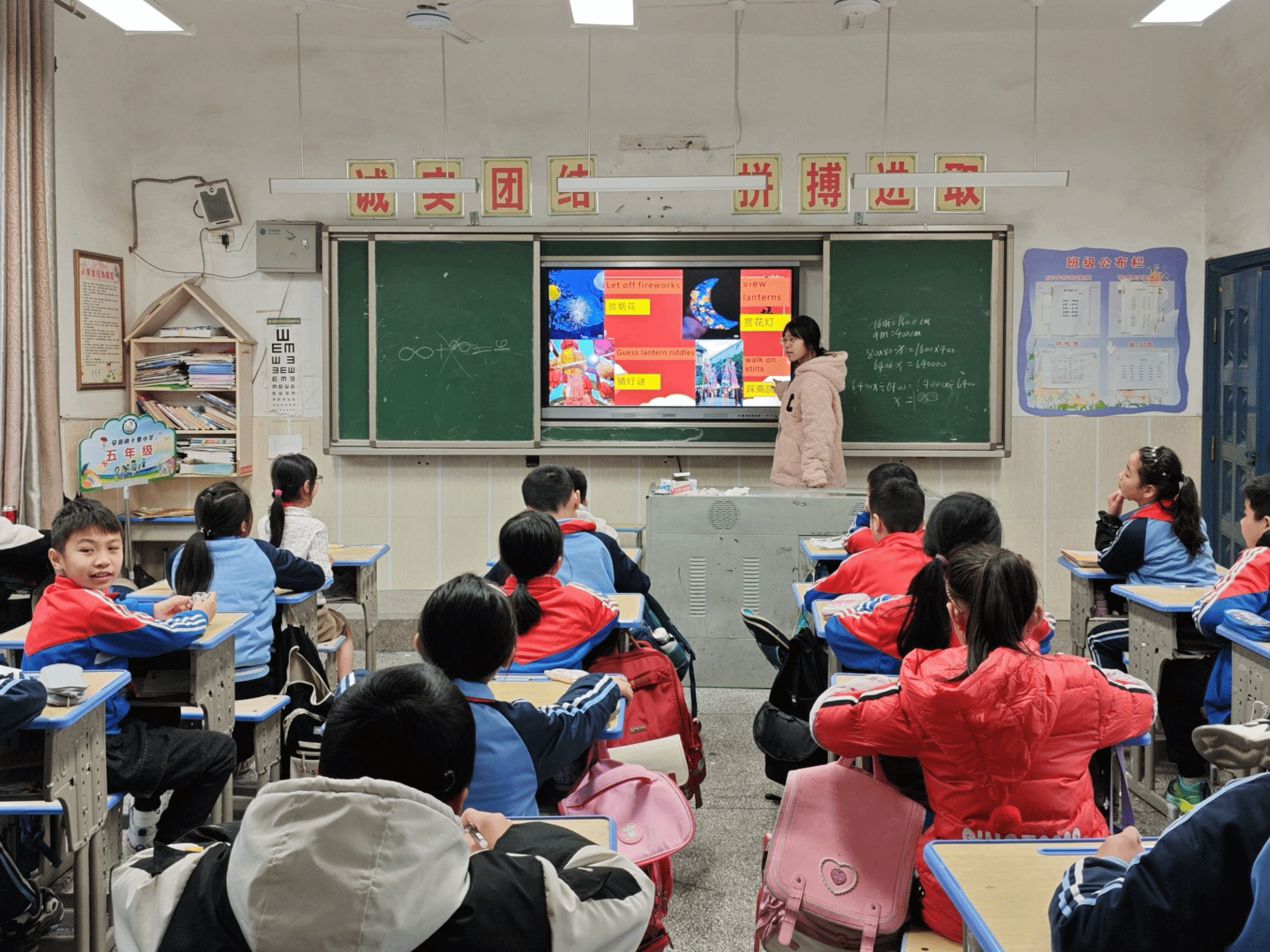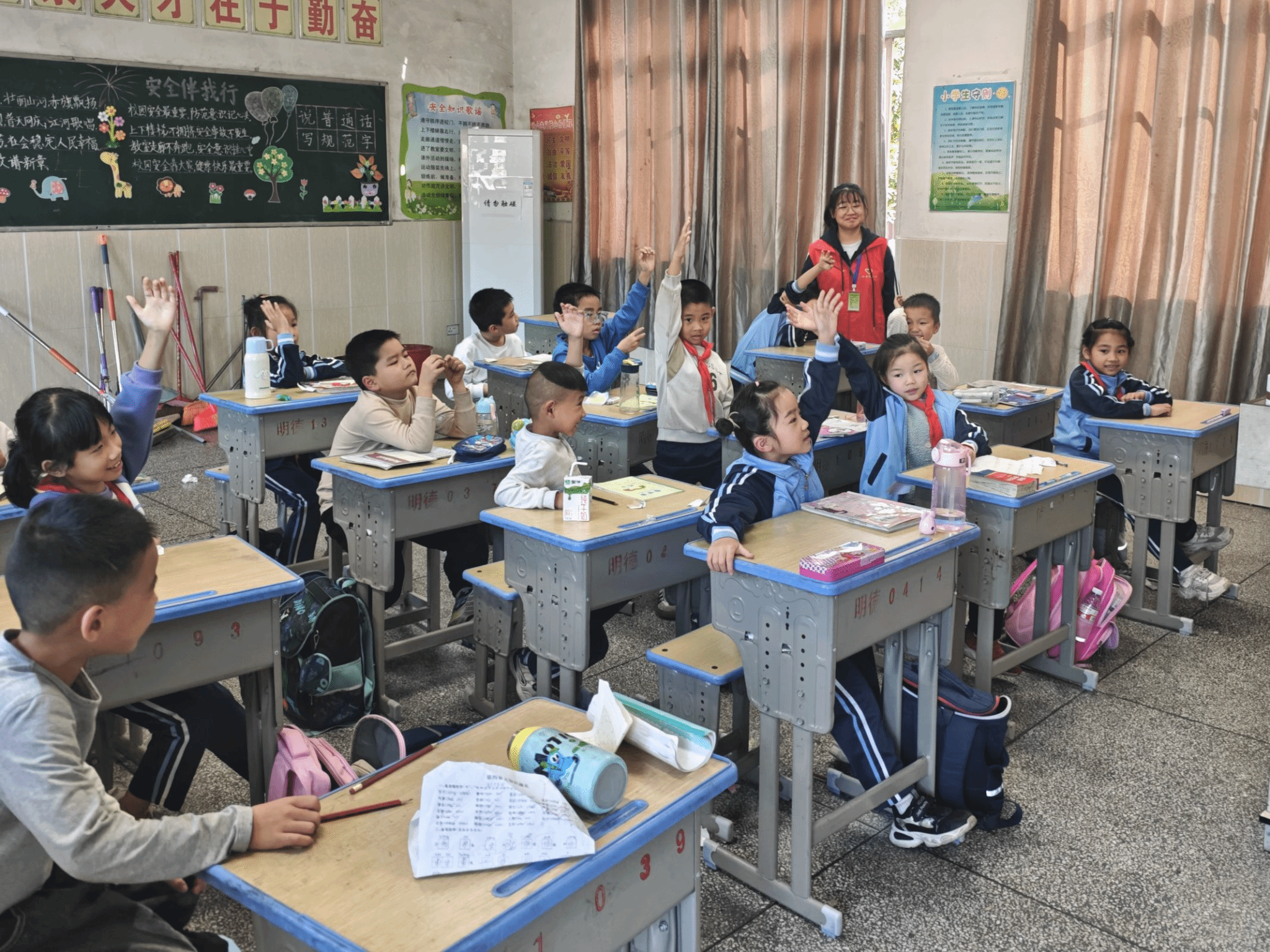 在上课前,小朋友们纷纷上前将志愿者们围住,热情地拥抱与问候,俨然没有了初始的拘谨与生疏。随着上课铃声响起,小朋友们有序地进入教室,志愿者们也随即开展生动有趣的教学。在课堂上,志愿者们用大自然的故事、猜谜语小游戏与互动的方式激发孩子们学习英语的兴趣,引导他们主动思考与探索,学习到更多英语课本上没有的新知识。美好的时光总是易逝,在不经意的一个转身、抬眸间,下课铃声响起,志愿者们不舍地与小朋友们道别,并在教学楼前合影留念。至此,此次活动圆满结束。