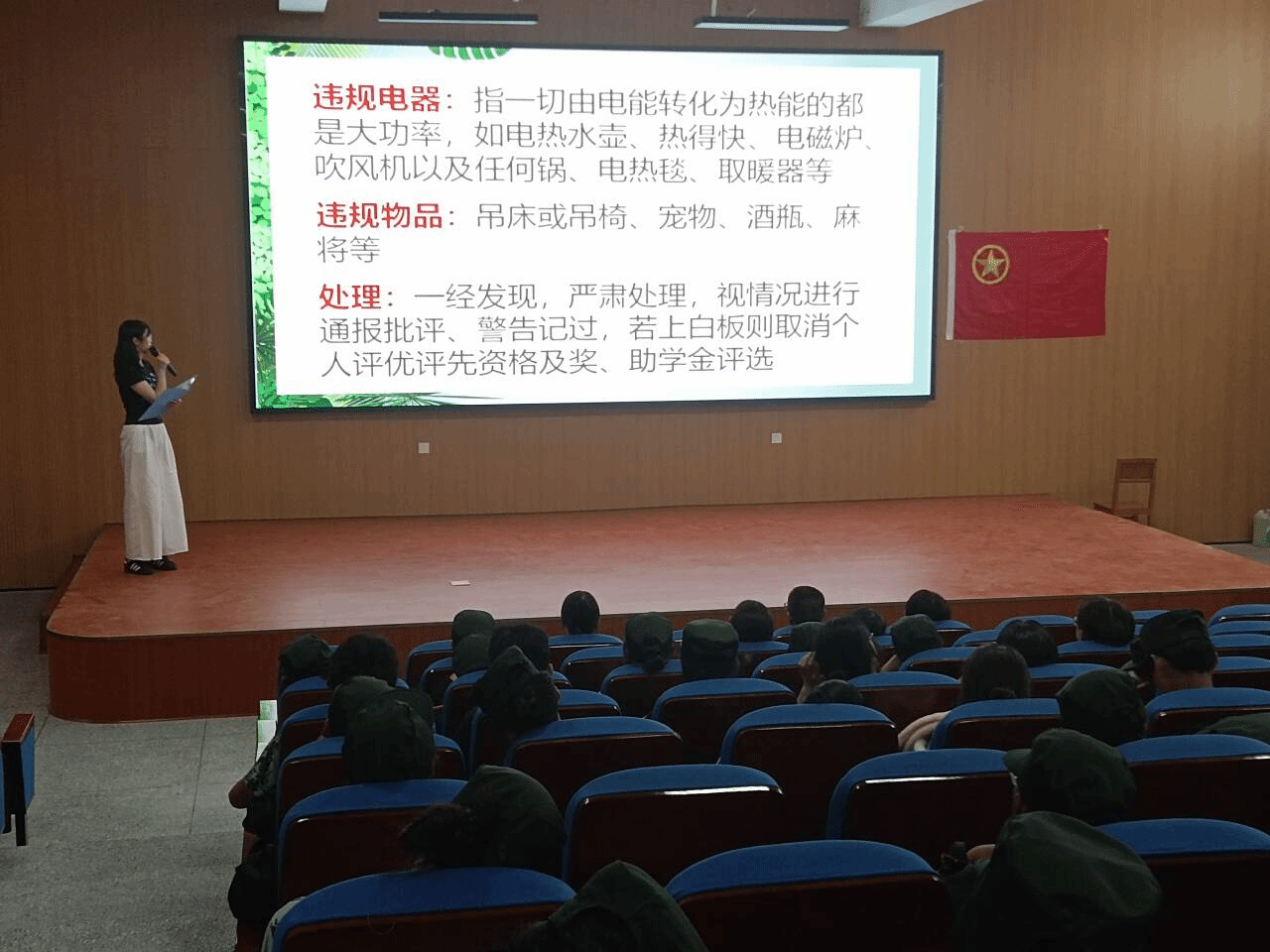 在安全教育讲座开始,主席团助理邹奕姿向同学们展示了防盗、防电、防骗、防火和防水等关于宿舍安全方面的知识。通过详细说明宿舍卫生检查安排、卫生检查注意事项和晚归检查,尤其强调了使用高功率电器和违反宿舍规章制度的后果,并且向同学们介绍了寝室零星维修方法,使同学们对宿舍安全意识有了明显提升。最后,刘书记上台讲话。书记再次强调了寝室安全知识,并强调了宿舍的卫生、安全和谐的重要性。此外,书记还特别强调了室友之间的关系,呼吁同学们要理解和包容彼此的差异,学会与室友和睦相处。