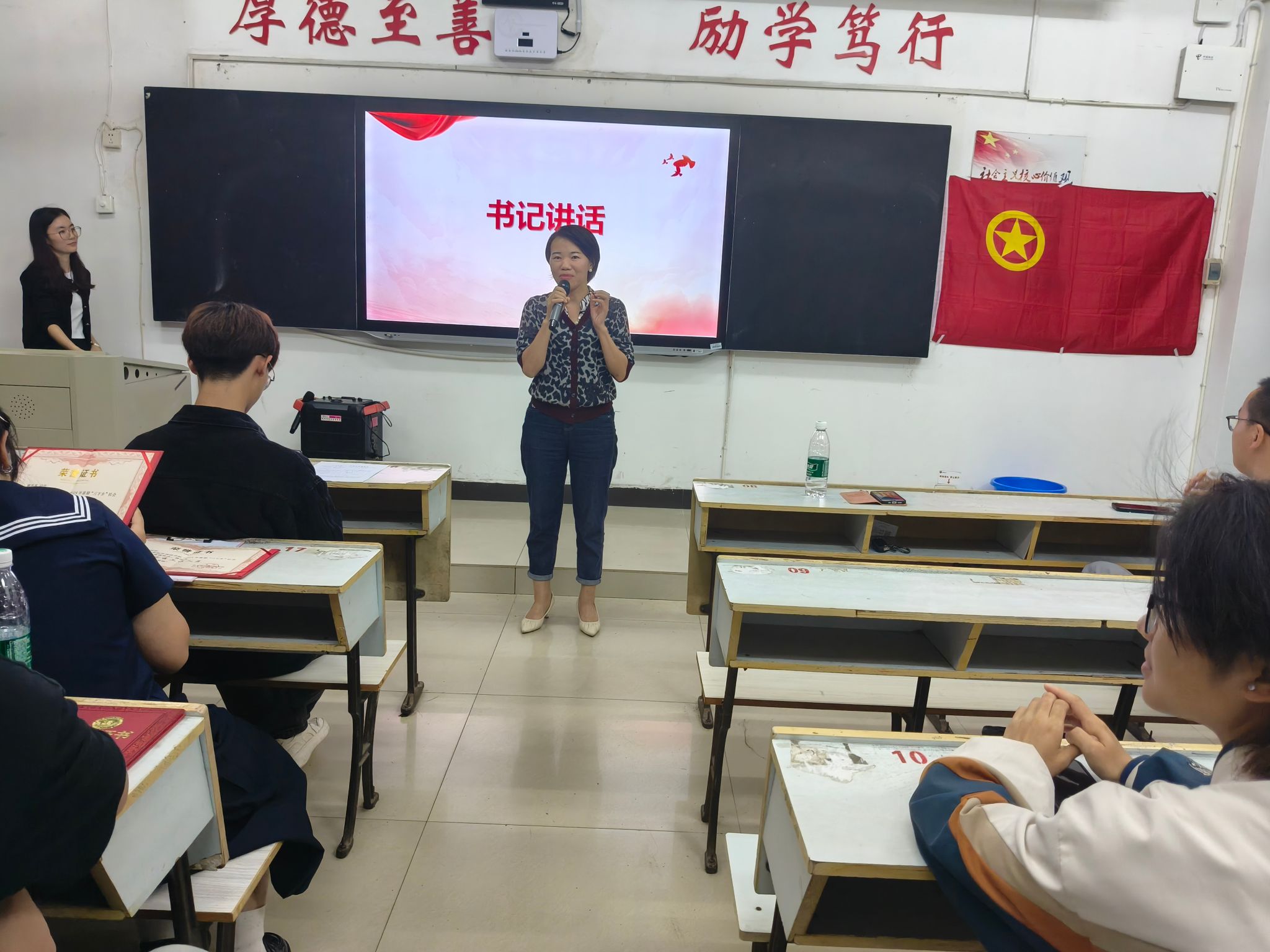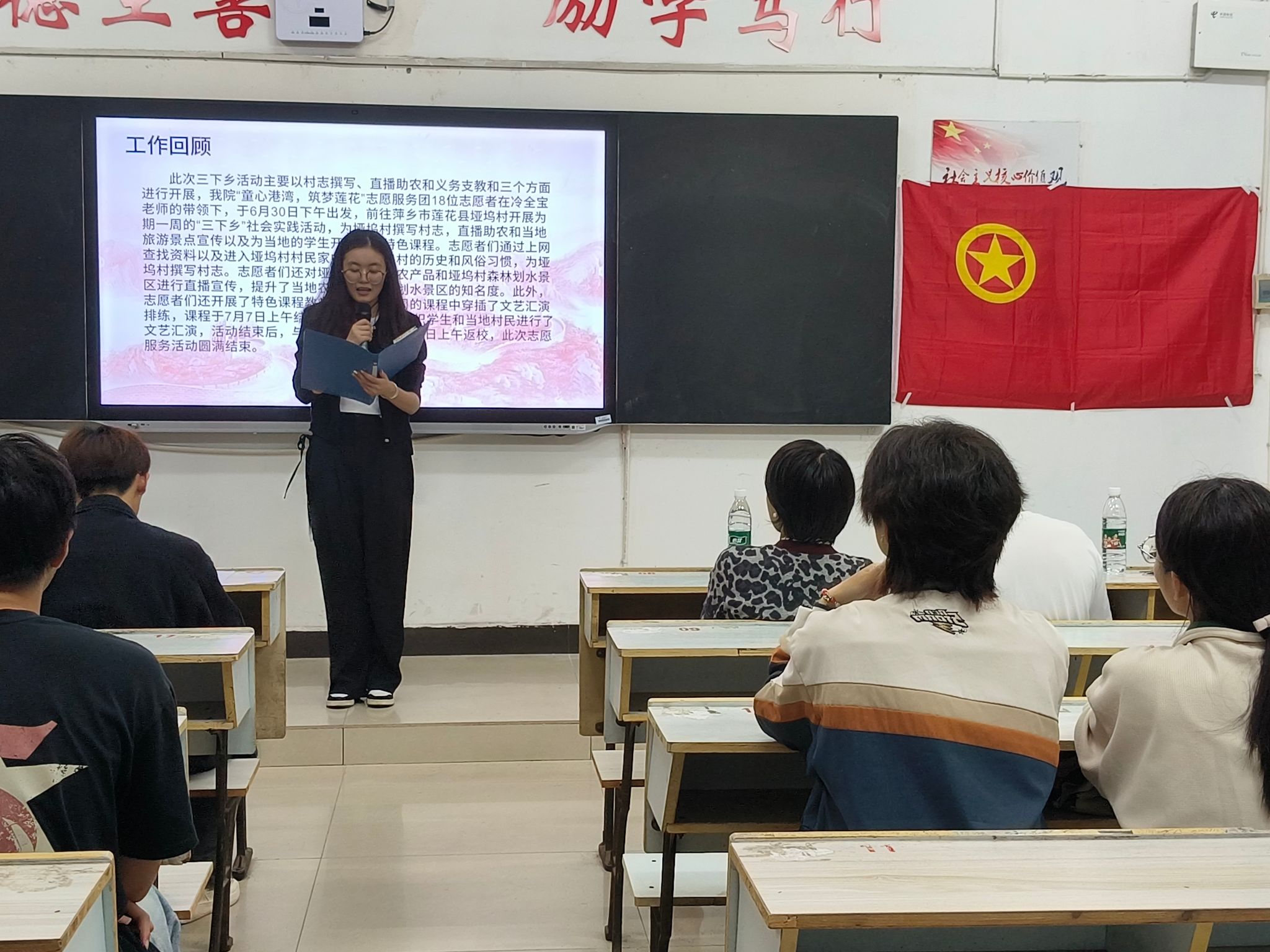 会议伊始,由主持人进行考勤,并且介绍到场的嘉宾们。接着,主持人裘佳美阐述了社会实践活动的意义及重要性,并就今年活动的整体情况进行了汇报。其中,回顾了整个“三下乡”活动,在冷全宝老师的带领下,志愿者于6月30号下午出发,前往萍乡市莲花县垭坞村开展为期一周的“三下乡”活动。活动期间,志愿者们为垭坞村撰写日志、直播助农、宣传地旅游景点以及为员工们开展了特色的课程。随后,志愿者们以演讲的方式生动地展现了他们在“三下乡”活动中的所见所闻和所思所感。他们不仅在直播助农、爱心支教中展现了当代青年的责任与担当,还在助力乡村振兴、传承文化等方面作出了积极贡献。汇报结束后,冷全宝老师对志愿者们的辛勤付出和取得的成果给予了高度评价,并且为他们颁发了证书。同时,他鼓励同学们在今后的社会实践活动中,继续将理论与实践相结合,不断提升自身的综合素质和社会责任感。活动最后,曹金萍书记希望大家能够不忘初心,牢记使命,在实践中不断成长,为国家和社会的发展贡献青春力量。