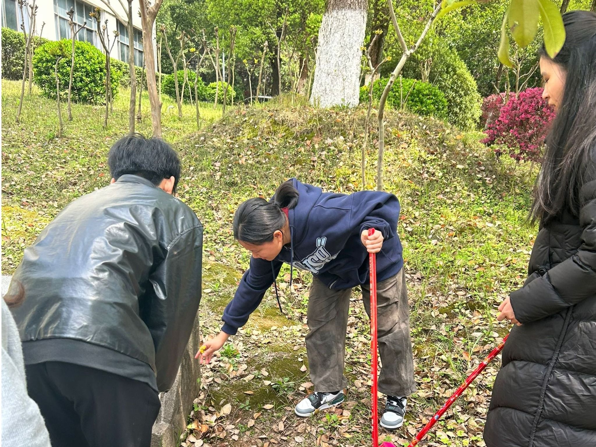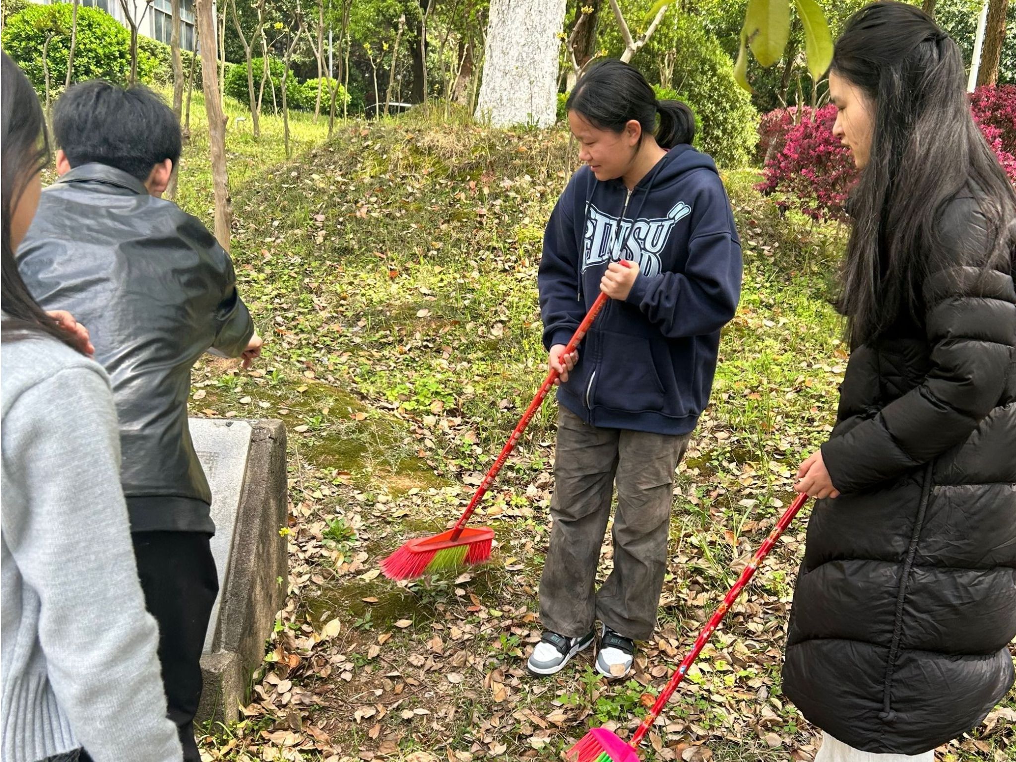 活动当日,春日暖阳倾洒而下,同学们先在学校十栋宿舍楼门前集合。大家精神抖擞,满怀热忱,在领取了扫帚、垃圾袋等清洁工具后,有序前往五四青年林。到达目的地后,同学们迅速按照预先安排好的分组,有条不紊地行动起来。一部分同学负责清扫纪念林周边的落叶,他们挥动扫帚,将层层堆积的落叶逐一聚拢,装入垃圾袋,随着垃圾袋逐渐鼓起,纪念林周边的地面也愈发整洁;另一部分同学则专注于擦拭五四青年林碑,手指沿着碑面的纹路缓缓移动,仔细擦拭着每一处缝隙,不放过任何一丝灰尘,让纪念碑更加庄严肃穆。清扫过程中,大家热烈交流着“五四精神”的内涵,分享着先辈们的英勇事迹,深刻感悟到如今的美好生活来之不易。清扫结束后,同学们最后整齐地排列在五四青年碑和鲜艳的五星红旗前,拍摄下具有纪念意义的合影。镜头定格的瞬间,大家脸上洋溢着自豪的笑容。