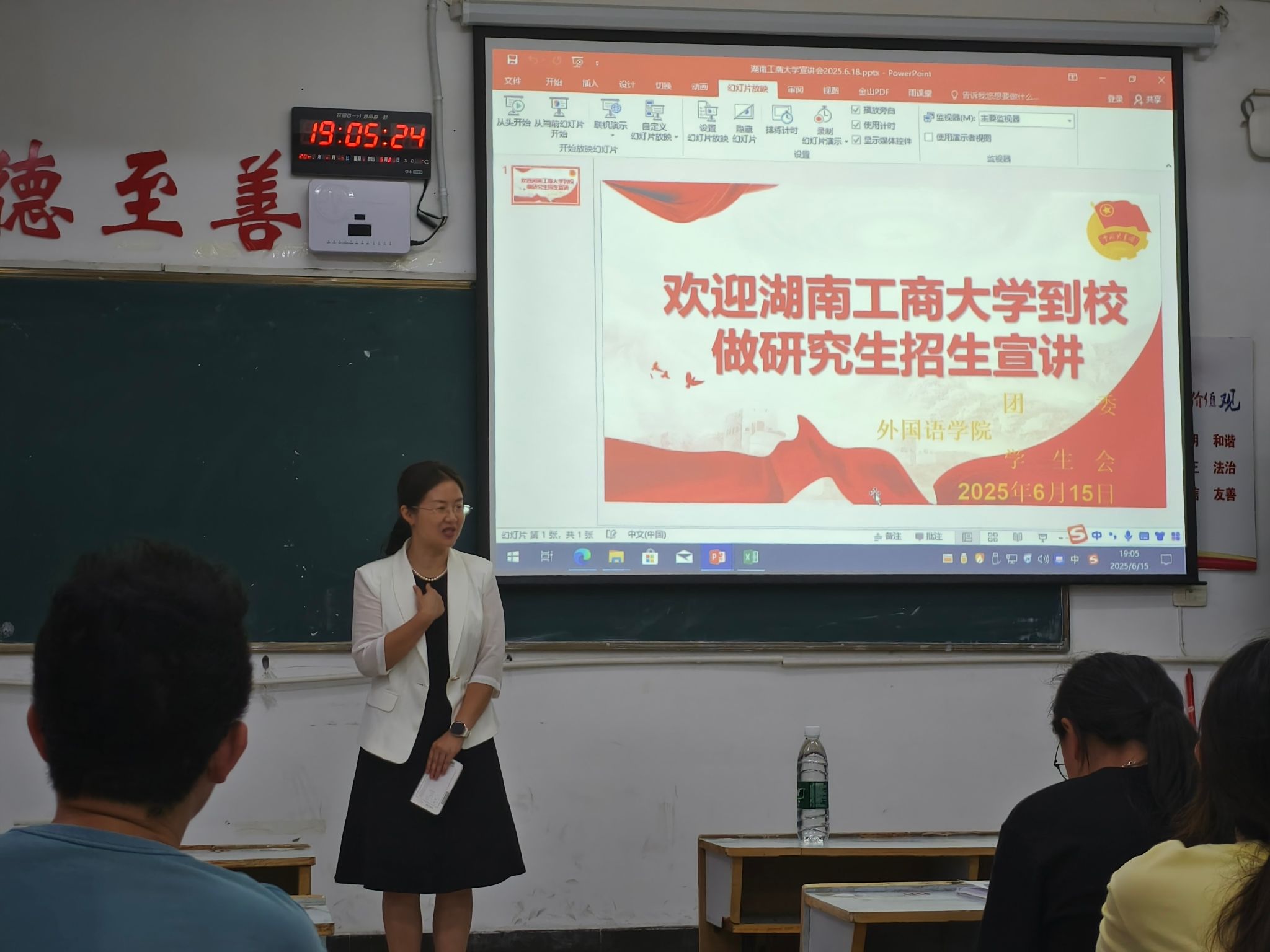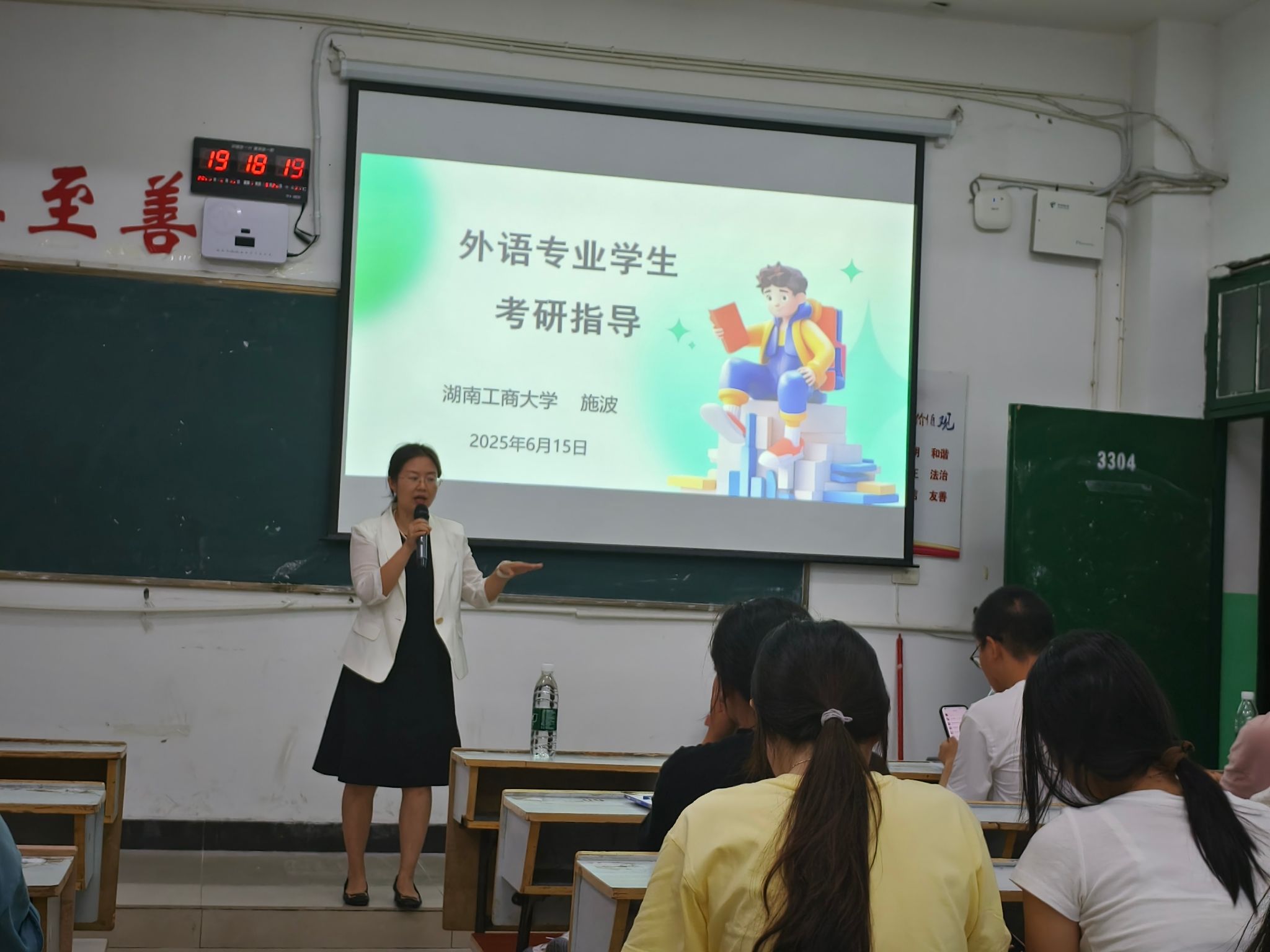 活动的开始,施波老师鼓励我们利用好暑假的黄金时间进行考研或其他实践活动,把握好时间。接着,施波老师给我们展示了几张湖南工商大学英语专业的员工参加博览会与外国友人友好交流的照片,并借此提出人工智能始终无法彻底取代人工进行翻译活动的观点。施波老师认为在面对面交流的过程中使用翻译工具不太恰当,仍旧需要人工进行翻译,随后,施波老师鼓励英语专业的员工要努力夯实语言基本功并介绍了英语专业等语言类专业的就业前景。接着,进入了本次宣讲的重点,在该过程中,施波老师首先提出问题“要不要考研”,接着很快便给出了肯定的答复,施波老师给到的原因是考研可以提高大家的就业竞争力。然后,施波老师给大家介绍了备考研究生要注意的以下几点:瞄准方向,量体裁衣,关注报考学校的考试大纲。接着呼吁大家发掘自己在外语专业的长处,多参加一些比赛也可以提高考研竞争力。