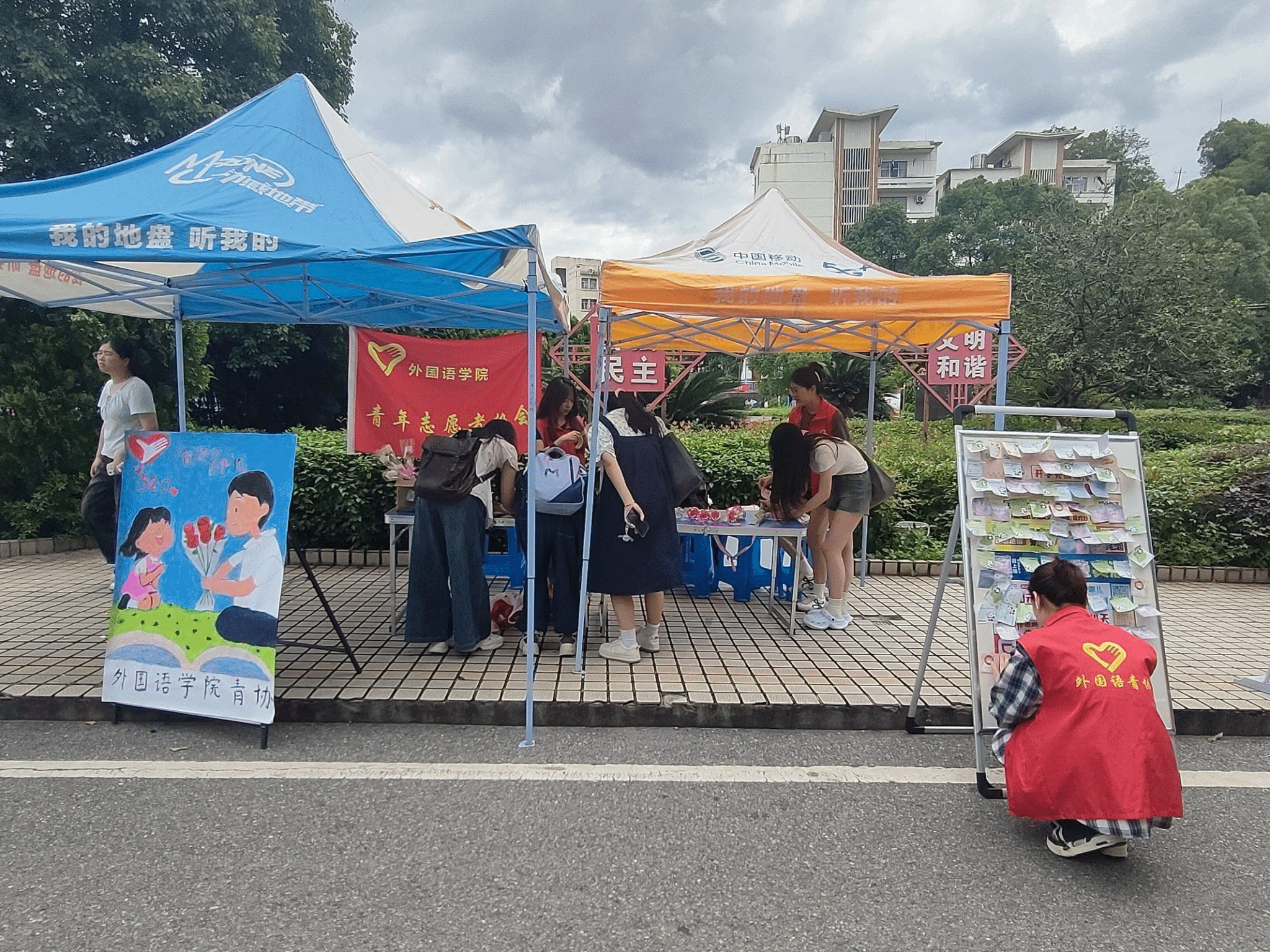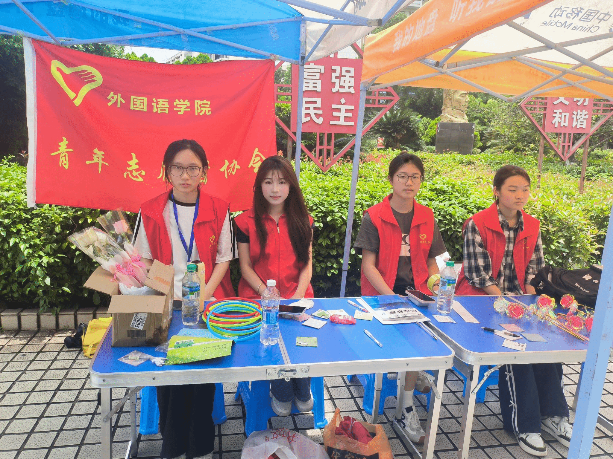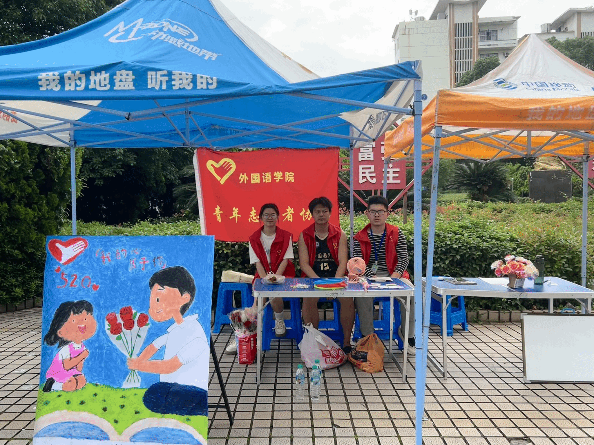 活动开始前,志愿者们早早来到现场,将场地布置得温馨而有趣。他们摆放好了琳琅满目的奖品,既有可爱的挂件,充满纪念意义的爱心币,也有浪漫的鲜花,每个奖品都承载着志愿者们满满的心意,等待着参与者用套圈“捕获”。同时,活动区域还设置了趣味互动展板,上面贴着用便签书写的爱的表达,吸引了不少同学驻足欣赏。活动进行中,现场迅速热闹起来。同学们纷纷排队领取套圈,跃跃欲试。每当有人成功套中奖品,现场便响起热烈的欢呼声和掌声;即便未能套中,大家也毫不气馁,笑着继续挑战。活动过程中,志愿者们始终坚守岗位,为参与者提供贴心服务。他们穿梭在人群中,及时补充套圈与奖品,耐心解答同学们的疑问,帮助维持现场秩序,确保活动有序进行。临近活动结束,志愿者们有序收拾现场,仔细检查后将会旗、马甲等物品收进值班室。至此,本次活动圆满结束。
