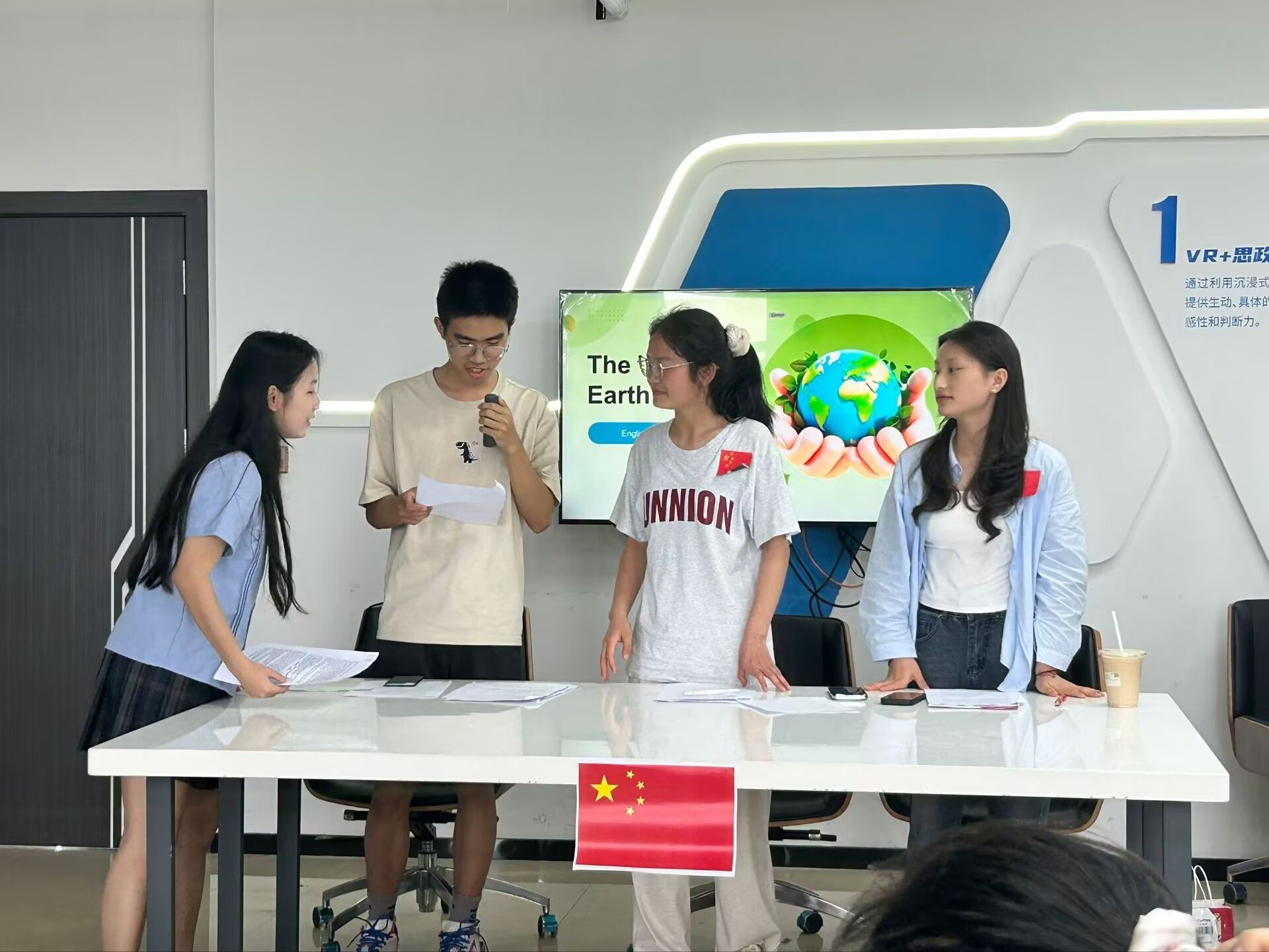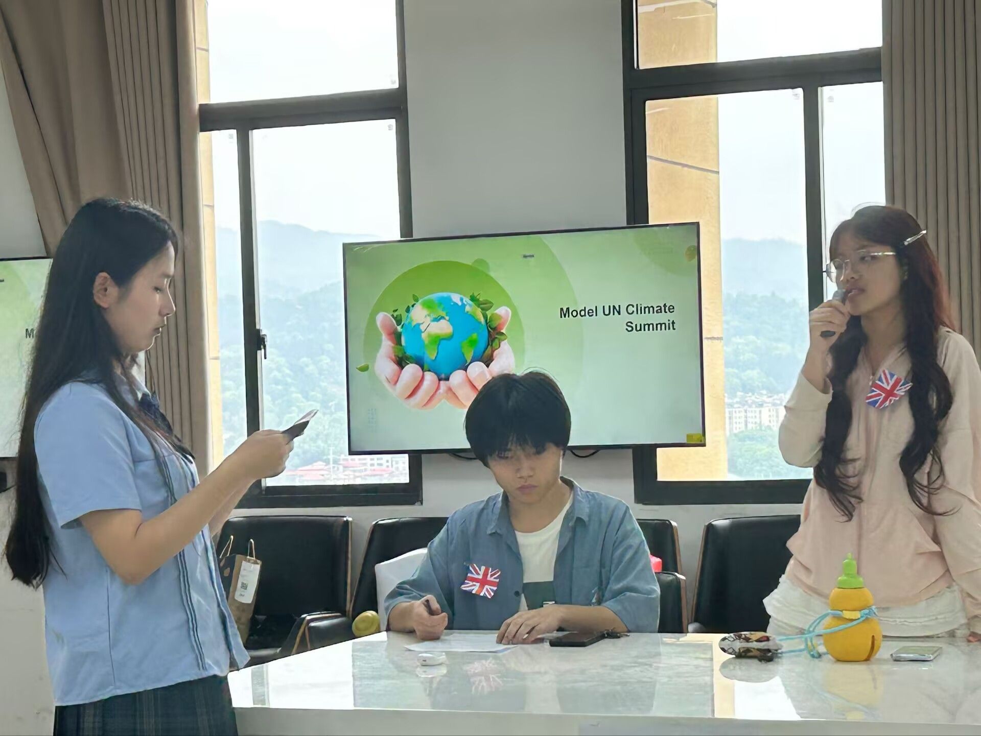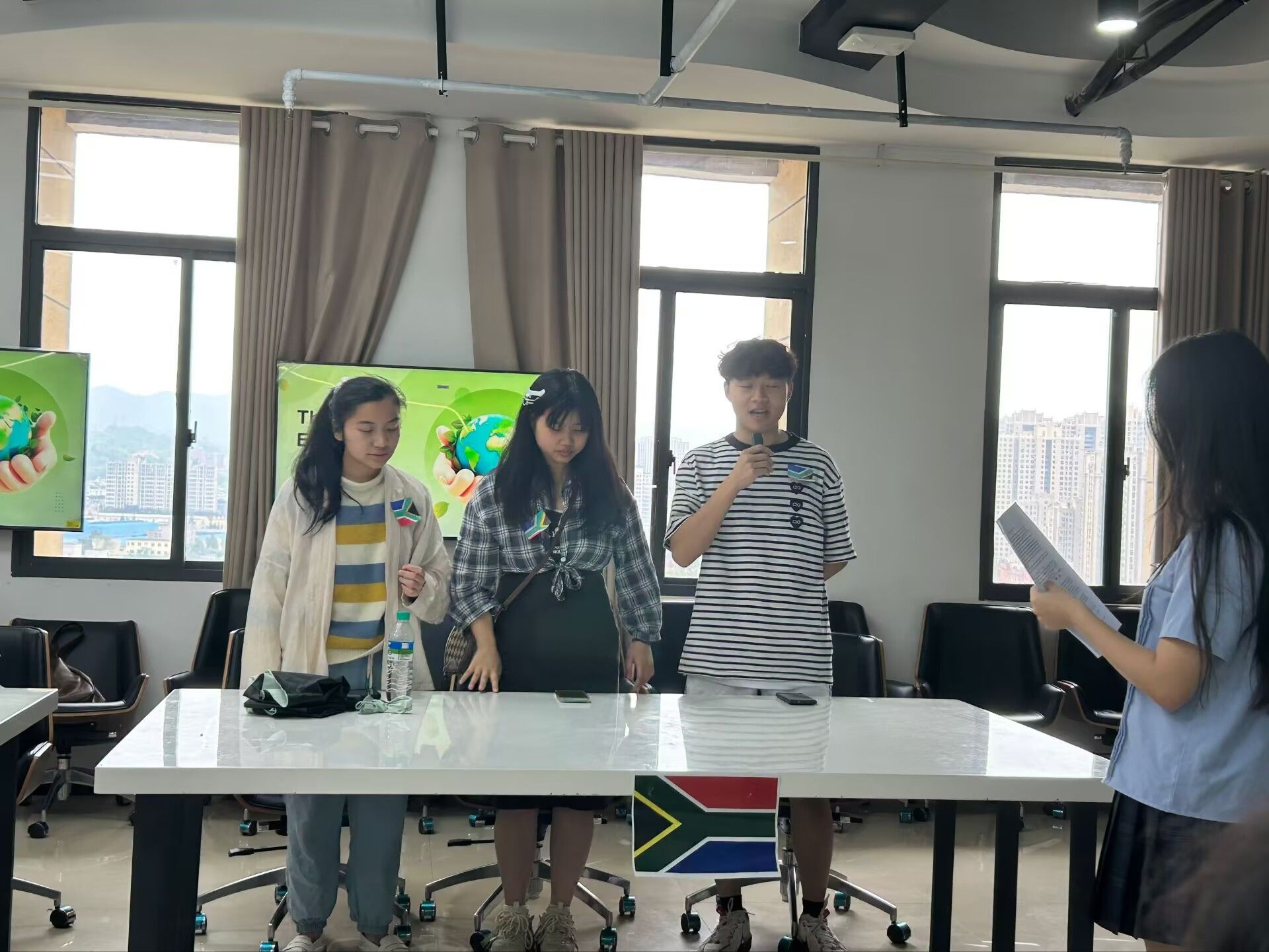 活动在轻松且充满活力的自我介绍环节中拉开帷幕,同学们依次用英语介绍自己的姓名与专业。这一环节不仅让大家结识了许多志同道合的朋友,更为重要的是,帮助同学们勇敢地迈出了用英语自信表达的第一步,为后续的深入交流奠定了良好基础。紧接着,活动迎来高潮——模拟联合国气候峰会。同学们分组协作,分别代表中国、非洲、英国、澳大利亚、格陵兰和美国等国家与地区。在公开讨论中,各小组围绕所代表国家气候问题展开深度剖析,诸如冰川融化、海平面上升、极端气候频发等。在探讨解决方案时,同学们展现出了全面且深入的思考。从个人层面提出践行低碳出行、节约用电用水、参与植树造林等解决方案;从国家政府层面则探讨了推行绿色税收政策、加大可再生能源研发投入等,尽显国际视野与责任担当。模拟峰会结束后,活动进入轻松愉悦的户外活动——垃圾分类飞行棋。在游戏过程中,同学们将英语运用与环保知识学习巧妙融合,在欢声笑语中深刻理解垃圾分类的重要性。活动接近尾声,外教 Joey 老师加入大家的讨论,与大家亲切交流,分享自己对于气候问题和环保行动的看法。最后,Joey 老师根据同学们在各个环节的综合表现进行颁奖,对大家在活动中的努力与优秀表现给予了充分肯定。