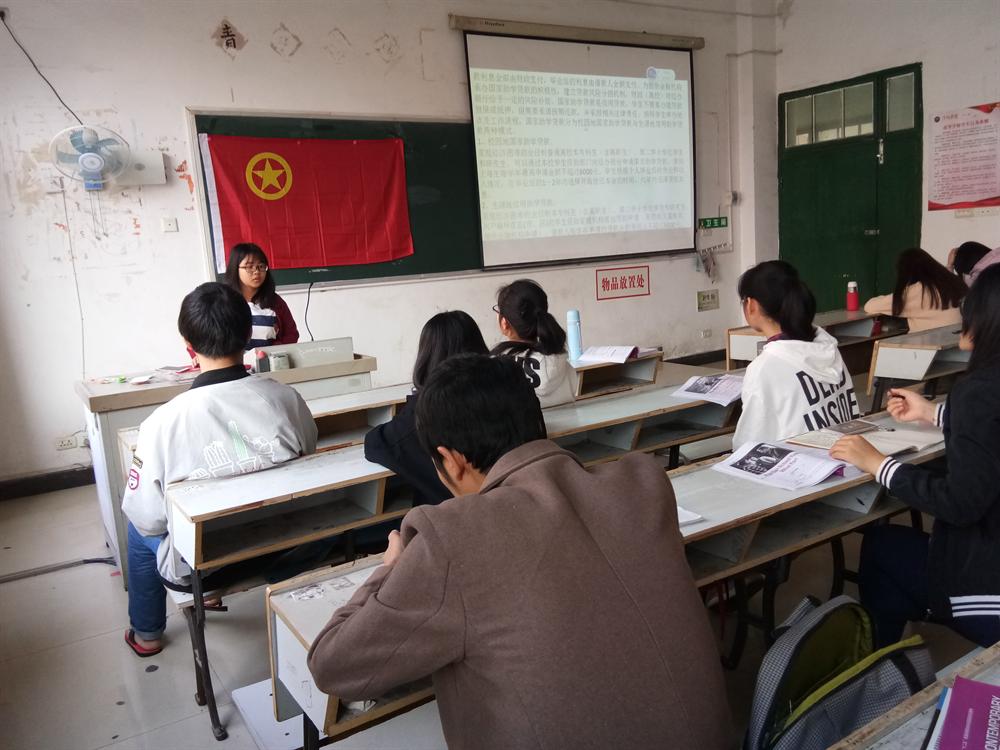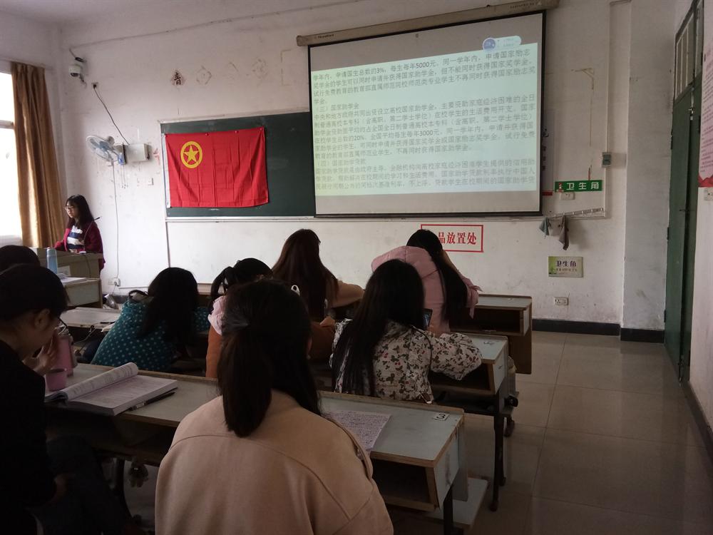 首先,由班长进行考勤。然后,班长通过ppt的演示向同学们详细解释了资助政策的有关细则,并针对同学们提出的相关问题作出了详细地解答。最后,本次活动圆满结束。