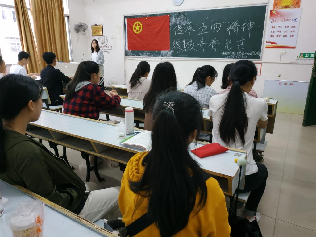 班会伊始,团支书向大家介绍了五四精神的具体内涵,五四精神代表着诚实、进步、自由、平等以及全社会幸福的统一体,是每位同学都需学习和弘扬的重要精神。接着,团支书向班上同学讲述了五四青年运动的整个历史背景和过程,班上同学深受感染。最后,团支书希望各位同学以不放弃的精神去解决生活和学习中的困难,好好传承五四精神,肩负时代重任,绽放青春光芒。