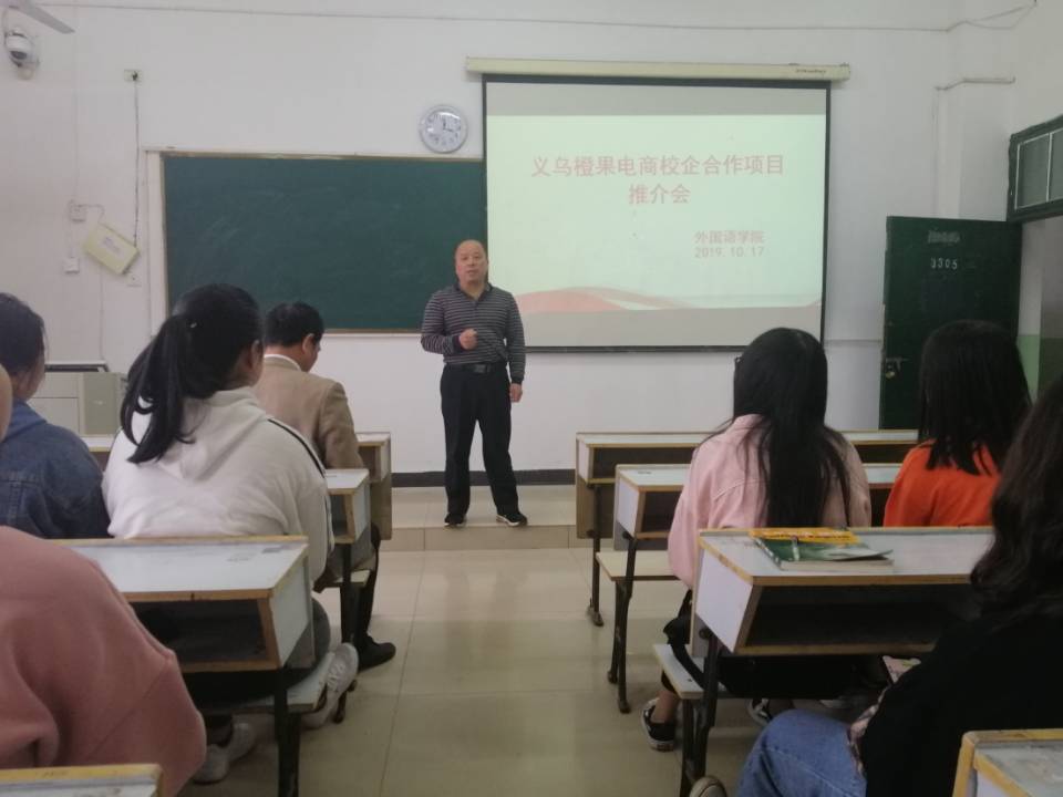 紧接着,橙果电商的陈总给同学们介绍了义乌橙果电商的发展历程以及他们的人才需求,并对员工在义乌的就业、创业前景进行了分析,鼓励同学们去义乌求职、发展。