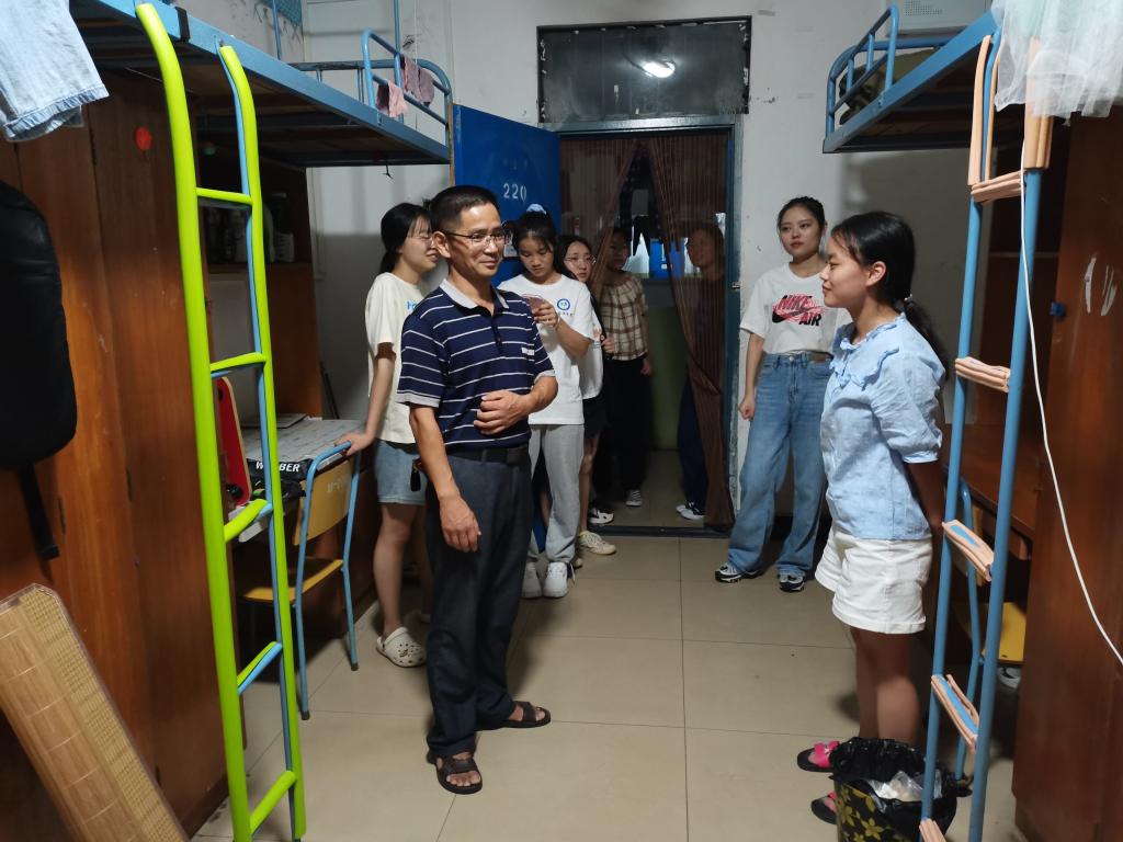 刘书记礼貌地敲门并得到了许可后进入寝室,感觉到新生们有些拘谨,书记先开了一个小玩笑缓解他们的紧张。之后感到新生们逐渐放松下来,书记与他们开始亲切友好的交流。书记先是询问了新生们军训期间的身体状况,并提醒他们注意寝室内的安全。随后,书记叮嘱新生,军训期间若有身体不适等情况应及时向教官报告。同时,书记也强调,要以正确的态度对待军训,积极配合教官们的工作。最后,刘书记告诉同学有什么疑问和不开心都可以和他沟通。新生们十分感谢书记的慰问并将他的嘱托铭记在心。