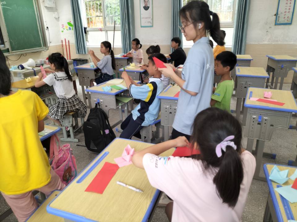 上午的亲身体验让老师们汲取了不少的教学经验,这也使下午的课堂进展变得更加地顺利。首先,我们来到手工课。课初,老师先为同学们放了一个动画视频,要求大家认真观看并积极举手发表观后想法,然后总结引出了今天的手工课制作主角。课堂正式开始,进入了实操环节。分发完材料后,孩子们积极地跟着老师的步骤动手制作,并在自己的努力下得到了第一个作品,成就感满满。这节课很好的激发了孩子们对手工制作的兴趣,同时也锻炼了动手动脑的能力。接着就是体育课了,同学们在老师的带领下来到了操场跑道,在确保全员到齐后,课前热身运动正式开始。今天的体育课不是跑步而是跳舞,一听到跳舞,大家的兴致就高涨了起来。课堂上,老师在大喇叭的协助下,耐心的将舞蹈动作进行分解并教给孩子们,整齐的口号,整齐的动作,现场氛围十分和谐。时间流逝,到这里,在孩子的欢声笑语中,支教第一天的课程就全部结束了。整理完事务后,伴着月光老师们也一齐返回寝室。