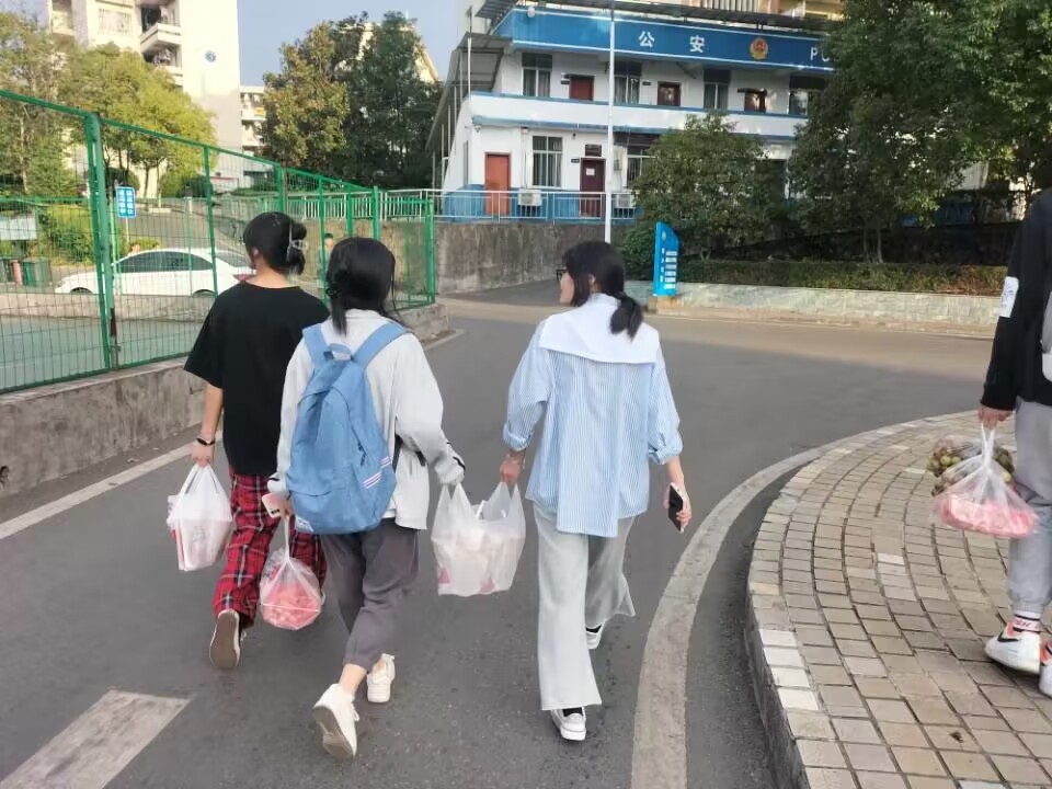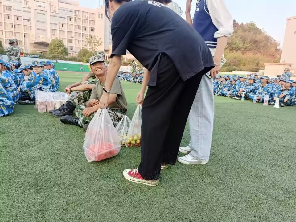 无军训,不青春。军训烈日下同学们脸上的汗珠,我想那便是青春的见证。今年的军训,由于疫情,晚来了一些,但学长学姐的关爱永远也不会迟到。此次活动由员工会各部门负责人自主安排时间展开,前期的准备是繁琐的,看望当天,大家分散各地,水果店、超市、奶茶店都能看到他们忙碌的身影,大堆的东西上贴满了便签,但每个人脸上洋溢着的都是幸福的表情。准备完毕后,提上大包小包的“小惊喜”大家一齐前往了军训场地。烈日当空照,新生们身着统一的军装,排列整齐,活力十足。一到军训场地,大家便迎来了新生热情地问候,一句句“学长学姐好”,温暖人心。教官们也开启了“休息”模式,暂停训练,开始有序地分发水果零食,在这炎热的军训天,送上一份清凉,丝丝关爱入心田。短暂的休息后,新生们又开始了在炽阳下的训练。