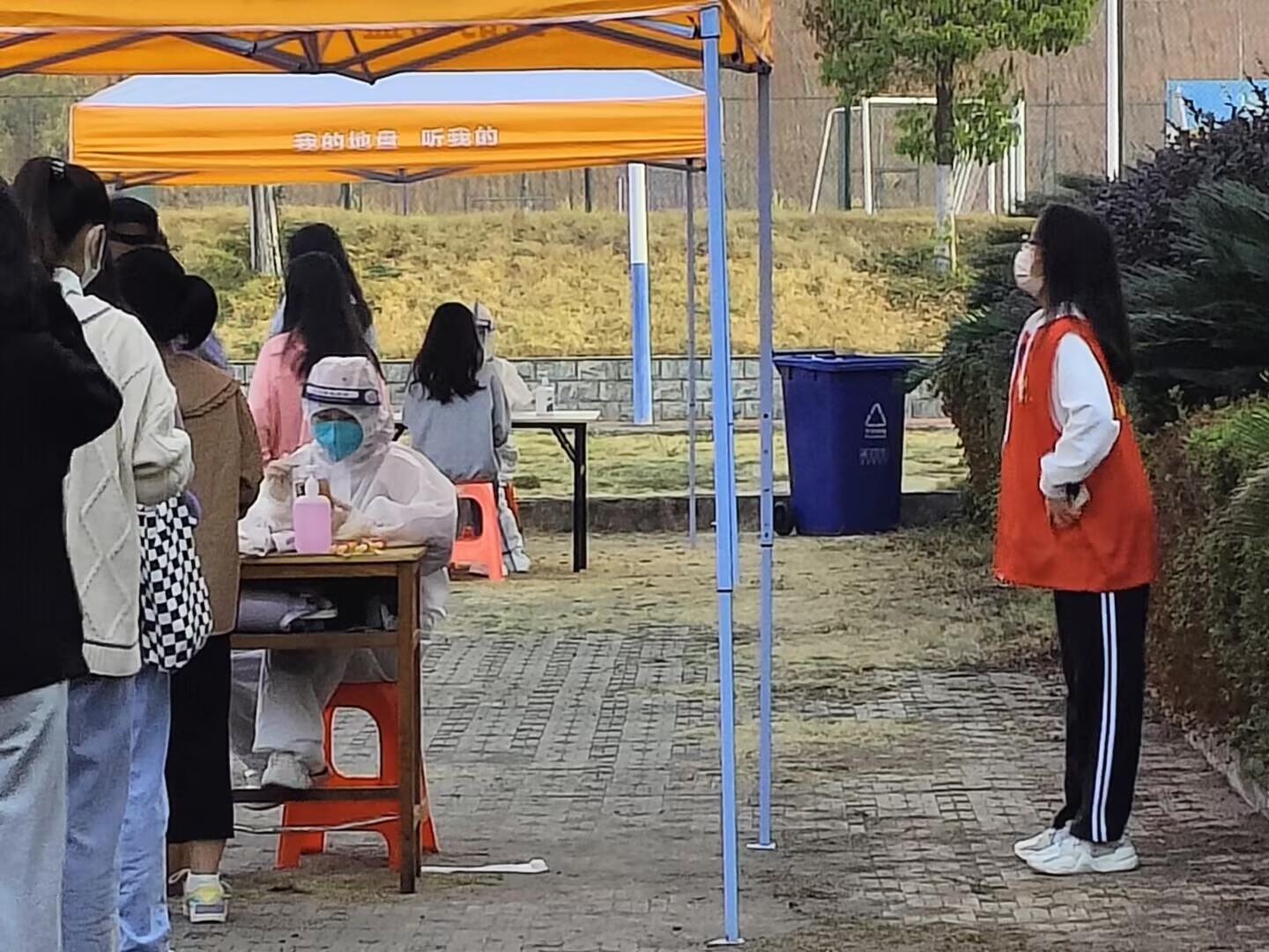 清晨的英华楼,澄净天空,悠悠鸟鸣,志愿者们准时到达指定核酸检测点,引导大家有序排队,检测体温、提醒同学们戴好口罩、保持“两米线”距离,做好核酸检测登记工作。保障每一项工作都严格按照防疫要求落实到位,用实际行动和责任担当,协助核酸检测工作有序进行。在做核酸期间,刘书记也参与其中,以身作则,带动着外院学子们积极参与核酸检测,并强调“特殊时期,特殊要求”的重要性。志愿者们身着红色志愿服,这抹红色,是爱心的颜色、是热血的颜色、也是无畏付出的颜色。它让我们感动,也让我们敬畏。五个多小时重复的工作虽然很累,但因为有她们才得以更好的进行。最后,在大家的合作配合下此次核酸检测工作圆满结束。