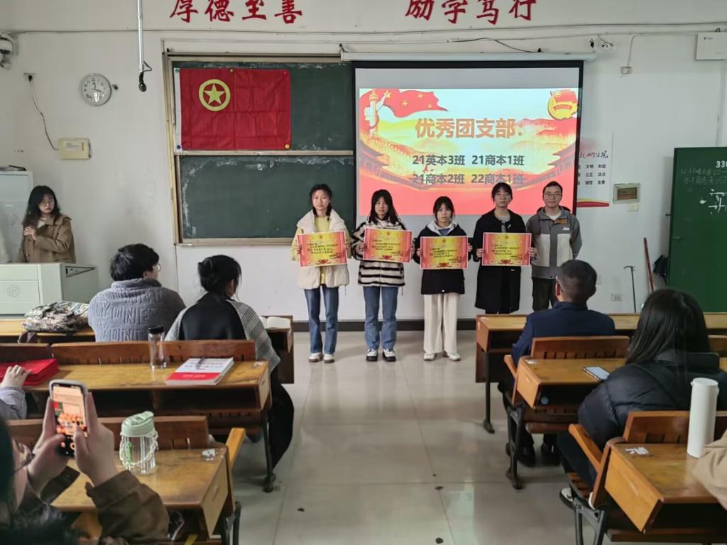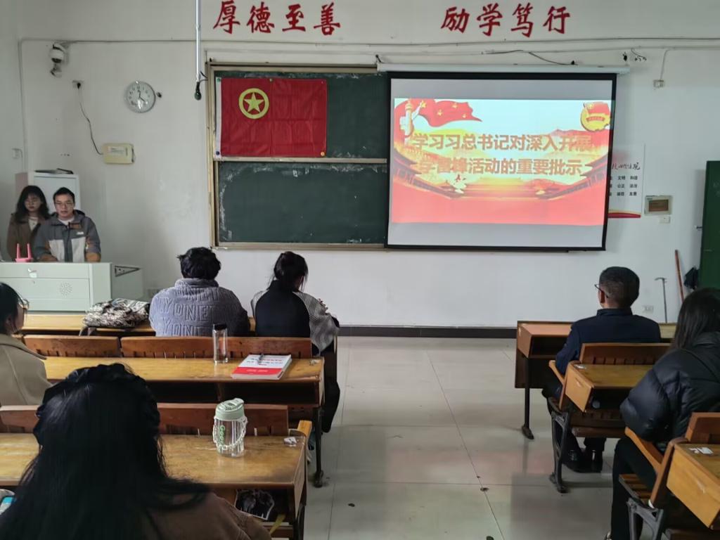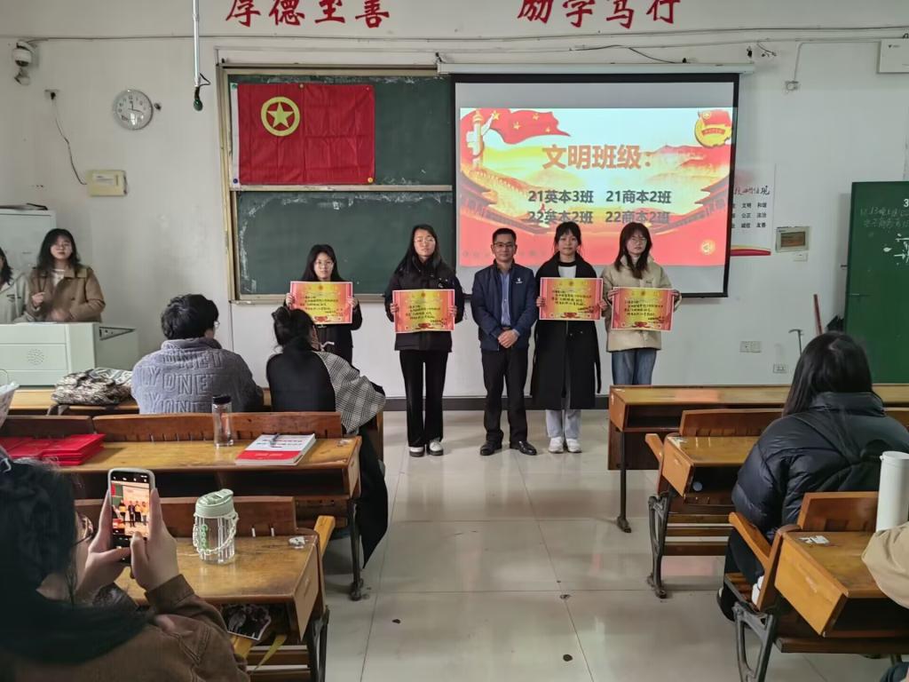大会始初,由办公室主任进行考勤,确保学干们准时到达会场。紧接着,进入颁奖环节,主持人宣布文明班级、优秀团支部、“My College Life”线上视频大赛获奖情况,并分别由刘书记、冷全宝老师、团委副书记毕鑫、书记助理余文彬为他们颁发奖状并合影留念。随后,由刘书记上台致辞。首先,他对同学们表示在新的一年与新的学期里希望大家能有新的变化与作为,同时强调做好新学期的计划是非常重要的。刘书记还鼓励我们要响应国家的号召,积极参与到学雷锋的活动当中去,做到在活动中锻炼与提升自我,在场的同学们都表示将谨记书记教诲,不断提升安全意识,学习意识与创新意识,增强团结力和凝聚力,并在新的一年做出更大贡献。接着,由冷全宝老师对“学习习总书记对深入开展学雷锋活动的重要批示”主题活动进行阐述。他强调,老员工应以实际行动来学习雷锋全心全意为人民服务的奉献精神,同时学好知识和苦练本领,用自己的专业能力去为国家付出,把青春奉献在国家的建设与乡村振兴中,争做新时代新青年,有一份光就要发一份热。最后,由员工会主席李闫潇对会议进行补充。她指出在校期间,大家应当互相协助、共同进步。同时,她也鼓励大家要认真学习,积极的为学院的活动开展建言献策,努力构建“优良班风、和谐校园”。
