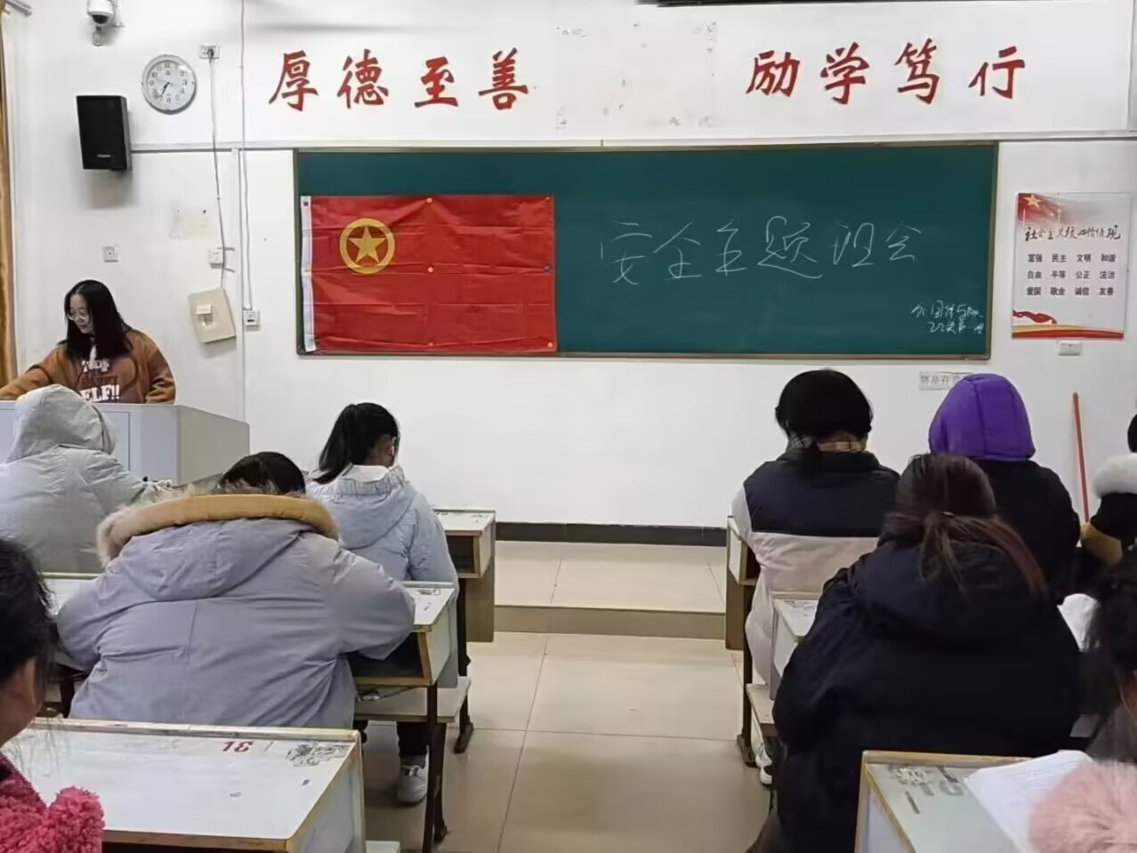 班会开始前由副班长进行考勤,全班同学到齐后,班长向大家说明本次班会的目的。首先,她向大家提及的是宿舍安全问题。在宿舍中应注意用电与消防安全,在日常生活中,我们不能使用违规电器以及注意排插的放置问题。其次,就是财产安全,班长提醒大家在宿舍内不要留存大额现金,如有贵重物品一定要妥善保管,同学们在离开宿舍后要记得及时锁门,防止财产丢失事故的发生。接着又提到了无烟校园,建设无烟校园,是消除校园安全隐患,建设健康文明校园的一项重要举措,我们作为学校的一份子就应该严格遵守校园校规,保持良好的校园环境。最后,她对这次班会进行总结,向大家提出做好自身安全防护的要求,提醒同学们要提高安全意识,此次班会到此结束。