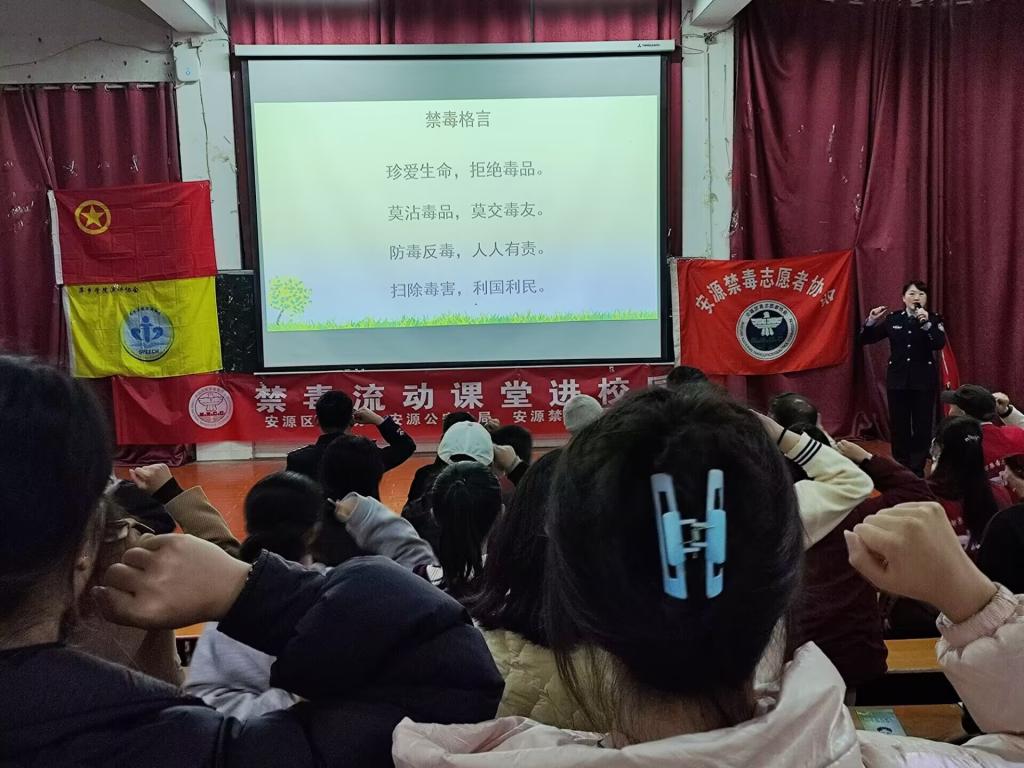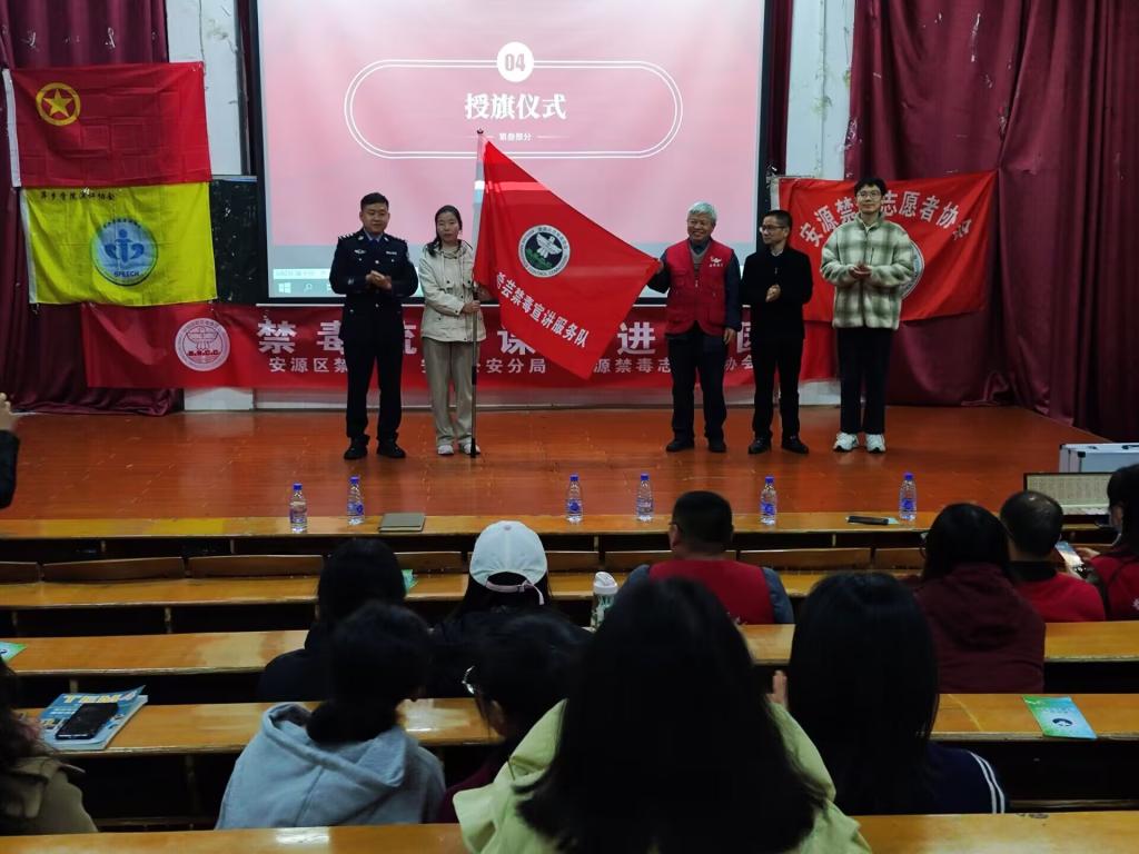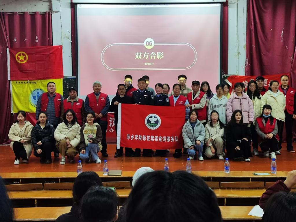 大会初始,主持人怀着激动的心情对大家的到来表示欢迎,现场氛围也十分活跃。之后,他庄重宣布希芸禁毒教育宣传项目启动仪式正式开始。大会第一项,由张磊主任致辞,他强调了禁毒宣讲队伍是禁毒工作中不可或缺的重要力量及一位优秀的禁毒员的重要性。随后,宋宇鑫老师致辞,在台上他鼓励同学们要做好禁毒宣传工作,勇于承担社会责任,坚决抵制毒品。接着,由项目负责人辜妍曦发言,她为大家讲述了希芸禁毒宣传项目的起源并呼吁各位青年老员工一起加入其中,为大家的健康、绿色生活环境贡献自己的一份力量。致辞结束后,张云主任开始宣讲,她先给同学们播放了一段在校老员工毒品预防教育为主题的视频,一个个熟悉的场景向观众们传递了禁毒的策略,也让同学们有所收获。紧接着,她通过播放PPT并结合真实事例为大家普及了三种类型的毒品及相关知识,科普完毕后,便进入了游戏互动与知识问答环节,整个环节中大家都十分踊跃、积极回答相关问题,同时也获得了具有纪念意义的小奖品。除了科普外,为了加深大家对禁毒内涵的理解,她还带领同学们一齐宣读禁毒格言,洪亮的嗓音彰显了大家对于禁毒的决心。禁毒是一件意义重大的事情,大家应从思想上、行动上筑牢拒毒防火墙。宣讲结束后,萍乡市区禁毒办的领导向项目组授旗并合影留念。随后,刘书记上台致辞,他真诚地对禁毒宣传工作人员和各位志愿者表示感谢,并呼吁同学们能够向身边的人传播禁毒知识,为社会和谐做贡献。最后,由工作人员为同学们展示毒品标本予以参观,各位领导嘉宾上台留影纪念,本次禁毒宣讲活动到此圆满结束。